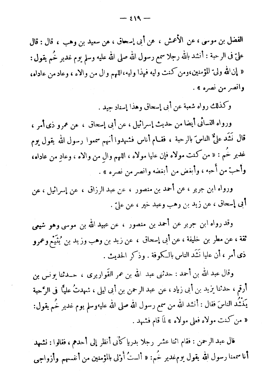 الْفَضْلِ بْنِ مُوسَى، عَنِ الْأَعْمَشِ، عَنْ أَبِي إِسْحَاقَ، عَنْ سَعِيدِ بْنِ وَهْبٍ، قَالَ: قَالَ عَلِيٌّ فِي الرَّحْبَةِ: أَنْشُدُ بِاللَّهِ رَجُلًا سَمِعَ رَسُولَ اللَّهِ صَلَّى اللَّهُ عَلَيْهِ وَسَلَّمَ يَوْمَ غَدِير خم يَقُول: " إِن الله وَلِيُّ الْمُؤْمِنِينَ، وَمَنْ كُنْتُ وَلِيُّهُ فَهَذَا وَلِيُّهُ، اللَّهُمَّ وَالِ مَنْ وَالَاهُ، وَعَادِ مَنْ عَادَاهُ، وَانْصُرْ مَنْ نَصَرَهُ ".