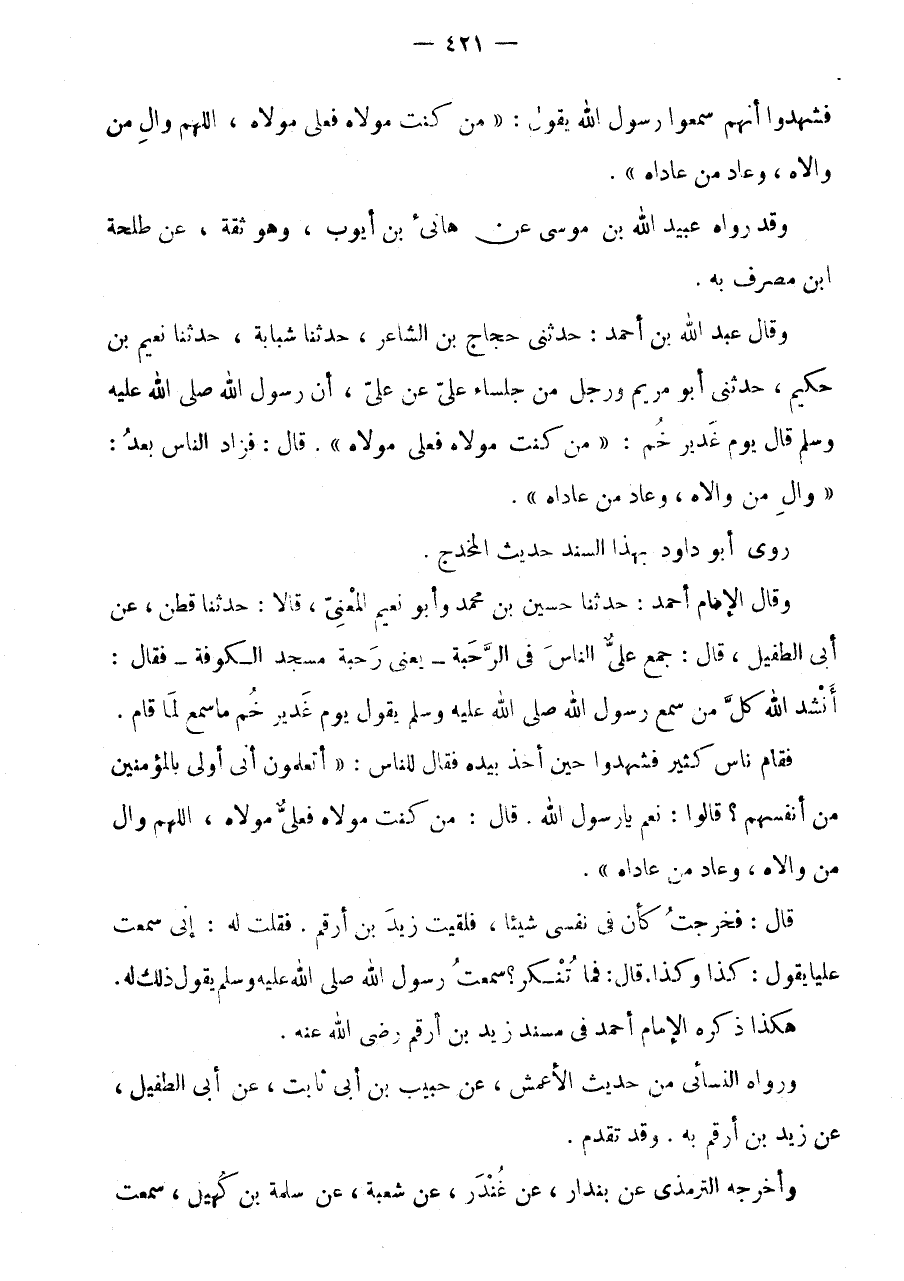قَالَ: مَنْ كُنْتُ مَوْلَاهُ فَعَلِيٌّ مَوْلَاهُ، اللَّهُمَّ وَالِ مَنْ وَالَاهُ، وَعَادِ مَنْ عَادَاهُ ".