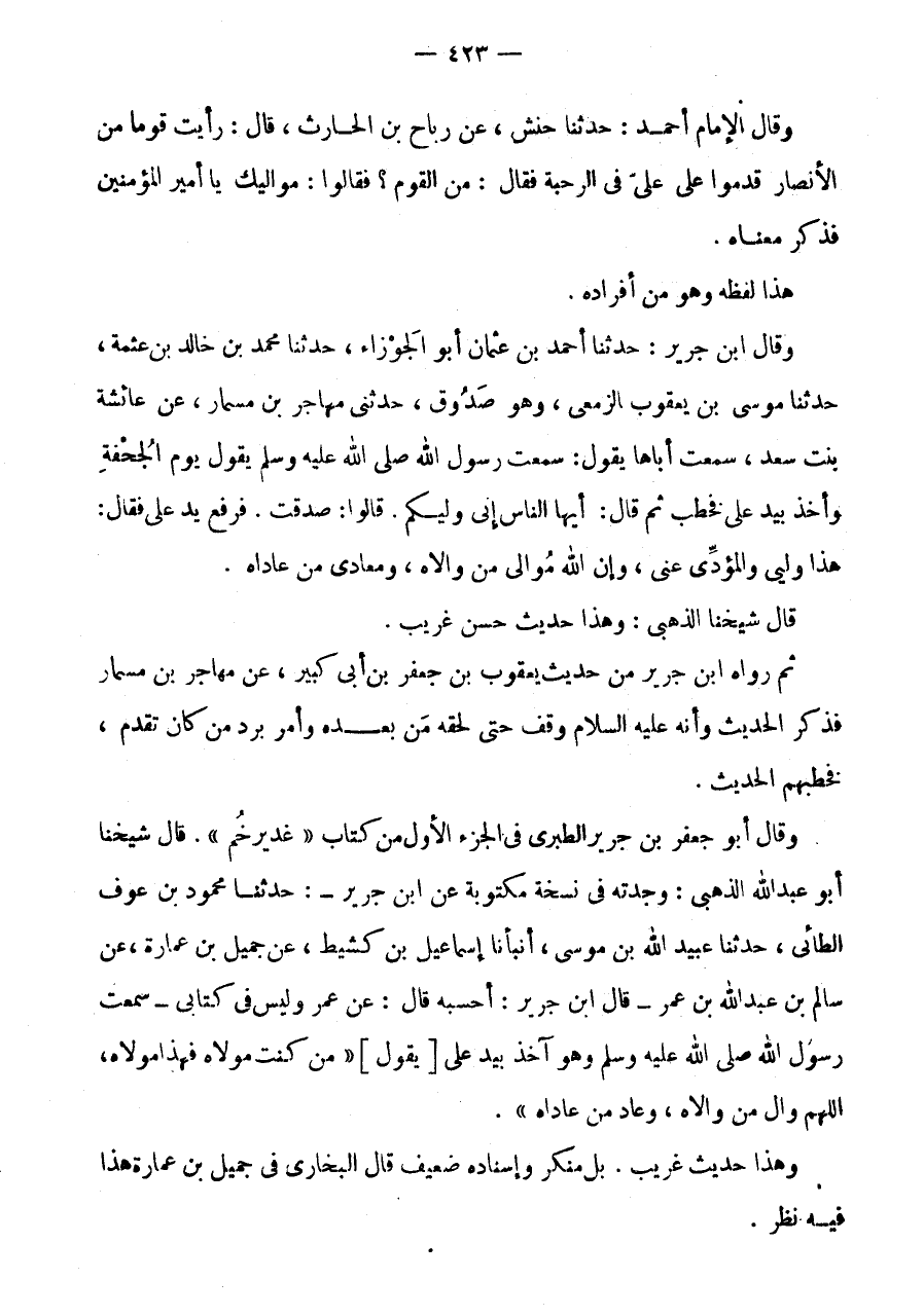 وَقَالَ أَبُو جَعْفَرِ بْنُ جَرِيرٍ الطَّبَرِيُّ فِي الْجُزْءِ الْأَوَّلِ مِنْ كِتَابِ " غَدِيرِ خُمٍّ ".