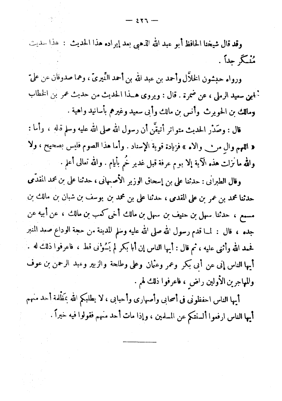 قَالَ: وَصَدْرُ الْحَدِيثِ مُتَوَاتِرٌ أَتَيَقَّنُ أَنَّ رَسُولَ اللَّهِ صَلَّى اللَّهُ عَلَيْهِ وَسَلَّمَ قَالَهُ، وَأَمَّا: " اللَّهُمَّ وَالِ مَنْ وَالَاهُ " فَزِيَادَةٌ قَوِيَّةُ الْإِسْنَادِ.