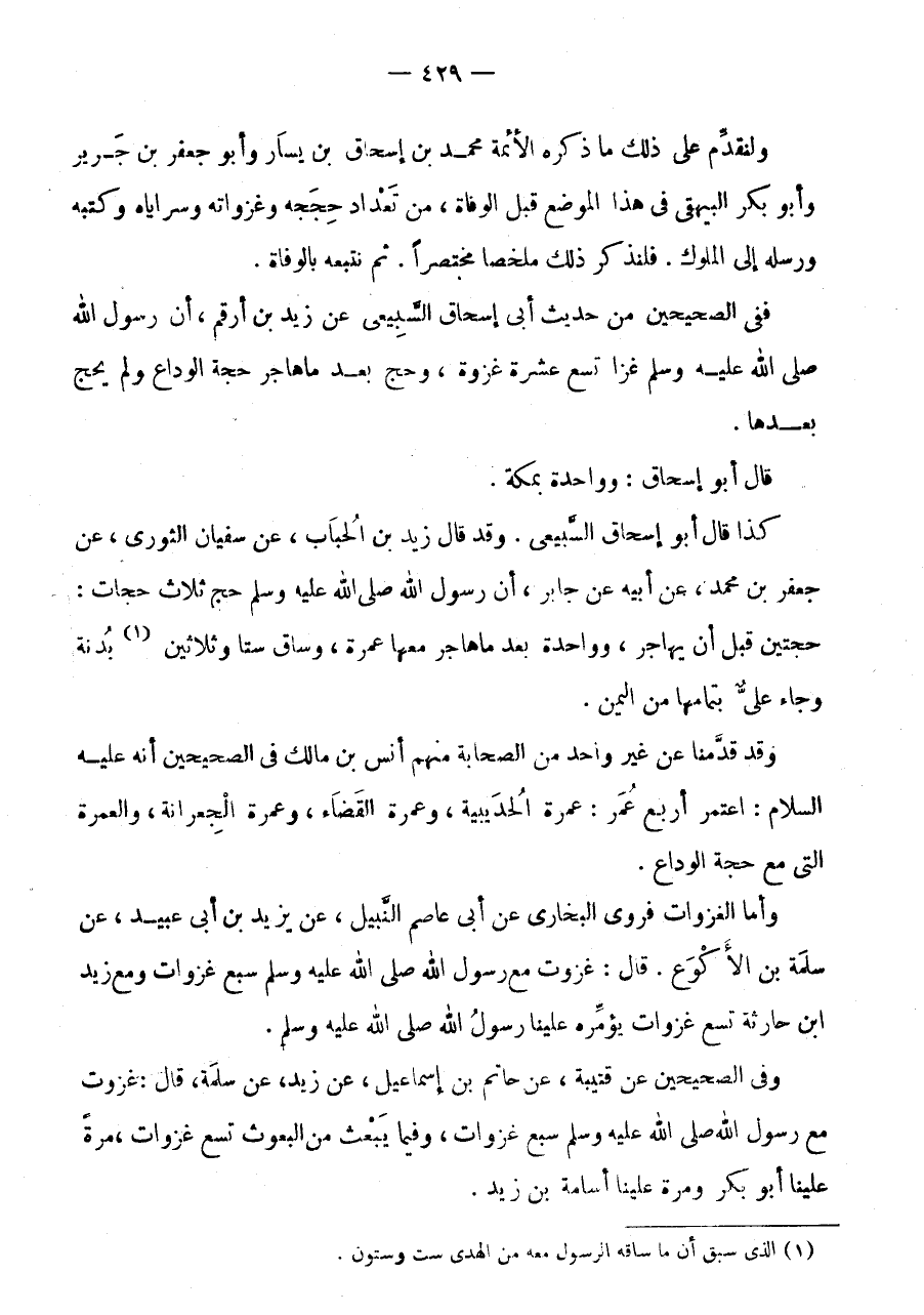 وَلْنُقَدِّمْ عَلَى ذَلِكَ مَا ذَكَرَهُ الْأَئِمَّةُ مُحَمَّدُ بْنُ إِسْحَاقَ بْنِ يَسَارٍ وَأَبُو جَعْفَرِ بْنُ جَرِيرٍ وَأَبُو بَكْرٍ الْبَيْهَقِيُّ فِي هَذَا الْمَوْضِعِ قَبْلَ الْوَفَاةِ، مِنْ تَعْدَادِ حِجَجِهِ وَغَزَوَاتِهِ وَسَرَايَاهُ وَكُتُبِهِ وَرُسُلِهِ إِلَى الْمُلُوكِ.