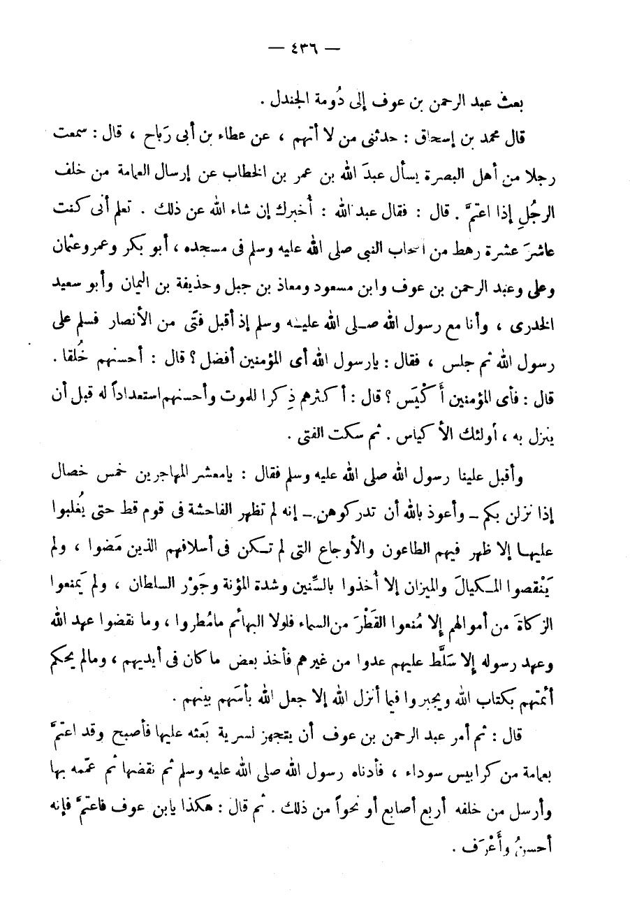 قَالَ: ثُمَّ أَمَرَ عَبْدَ الرَّحْمَنِ بْنَ عَوْفٍ أَنْ يَتَجَهَّزَ لِسَرِيَّةٍ بَعَثَهُ عَلَيْهَا فَأَصْبَحَ وَقَدِ اعْتَمَّ بِعِمَامَةٍ مِنْ كَرَابِيسَ سَوْدَاءَ، فَأَدْنَاهُ رَسُولُ اللَّهِ صَلَّى اللَّهُ عَلَيْهِ وَسَلَّمَ ثُمَّ نَقَضَهَا ثُمَّ عَمَّمَهُ بِهَا وَأَرْسَلَ مِنْ خَلْفِهِ أَرْبَعَ أَصَابِعَ أَوْ نَحْوًا مِنْ ذَلِكَ.
