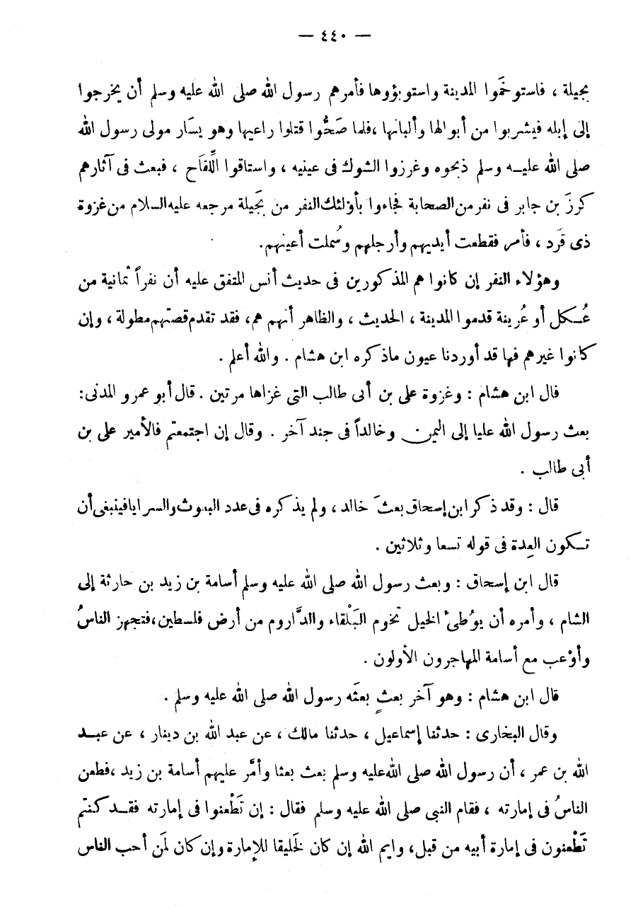 وَقَالَ البُخَارِيّ: حَدثنَا إِسْمَاعِيل، حَدثنَا مَالِكٍ، عَنْ عَبْدِ اللَّهِ بْنِ دِينَارٍ، عَنِ عَبْدِ اللَّهِ بْنِ عُمَرَ، أَنَّ رَسُولَ اللَّهِ صَلَّى اللَّهُ عَلَيْهِ وَسَلَّمَ بَعَثَ بَعْثًا وَأَمَّرَ عَلَيْهِمْ أُسَامَةَ بْنَ زَيْدٍ، فَطَعَنَ النَّاسُ فِي إِمَارَتِهِ، فَقَامَ النَّبِيِّ صَلَّى اللَّهُ عَلَيْهِ وَسَلَّمَ فَقَالَ: إِنَّ تَطْعَنُوا فِي إِمَارَتِهِ فَقَدْ كُنْتُمْ تَطْعَنُونَ فِي إِمَارَةِ أَبِيهِ مِنْ قَبْلُ، وَايْمُ اللَّهِ إِنْ كَانَ لَخَلِيقًا لِلْإِمَارَةِ وَإِنْ كَانَ لَمِنْ أَحَبِّ النَّاسِ