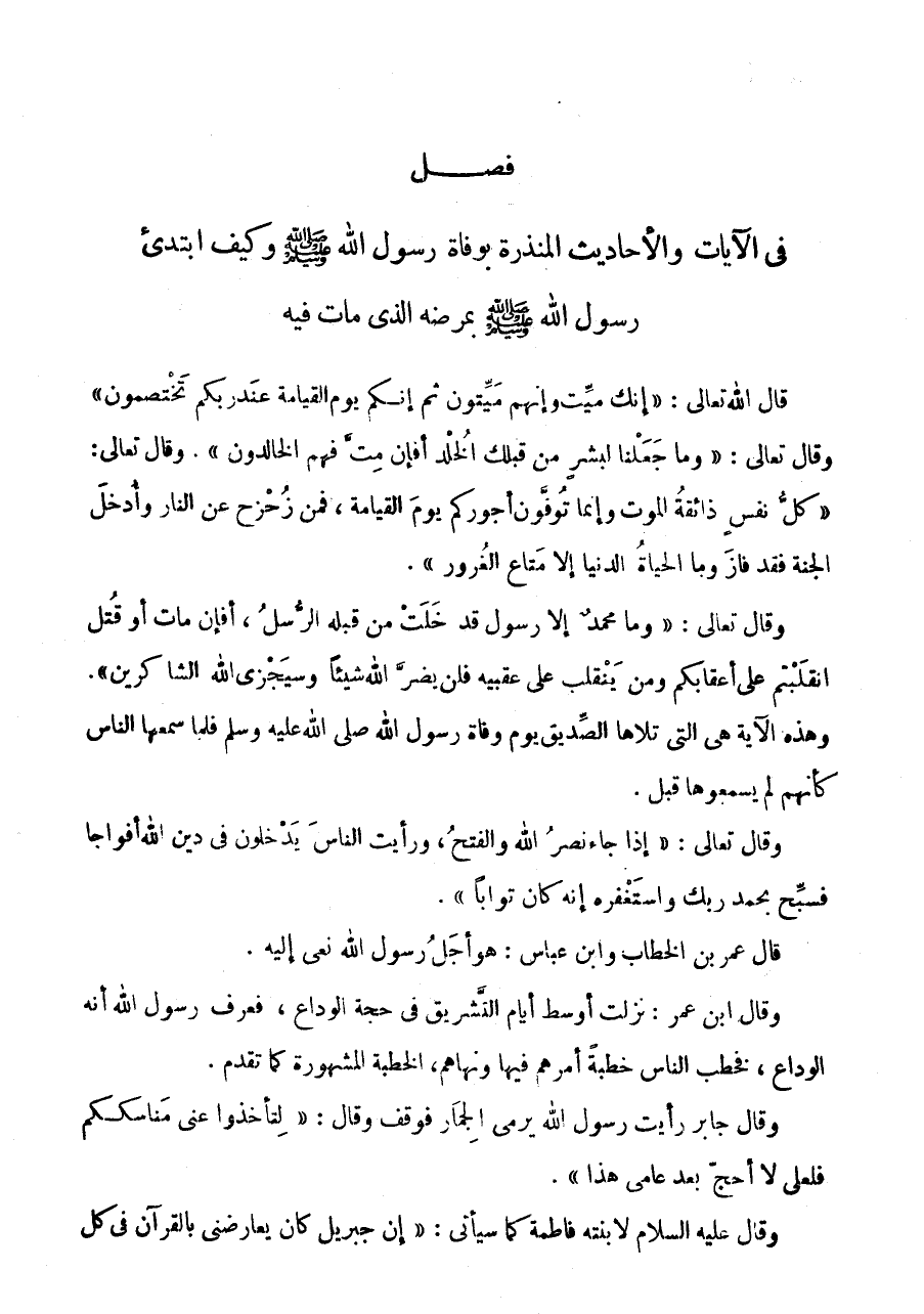 فَصْلٌ فِي الْآيَاتِ وَالْأَحَادِيثِ الْمُنْذِرَةِ بِوَفَاةِ رَسُولِ اللَّهِ صَلَّى اللَّهُ عَلَيْهِ وَسَلَّمَ وَكَيْفَ ابْتُدِئَ رَسُولُ اللَّهِ صَلَّى اللَّهُ عَلَيْهِ وَسَلَّمَ بِمَرَضِهِ الَّذِي مَاتَ فِيهِ قَالَ اللَّهُ تَعَالَى: " إِنَّكَ مَيِّتٌ وَإِنَّهُمْ مَيِّتُونَ ثُمَّ إِنَّكُمْ يَوْمَ الْقِيَامَة عِنْد ربكُم تختصمون "