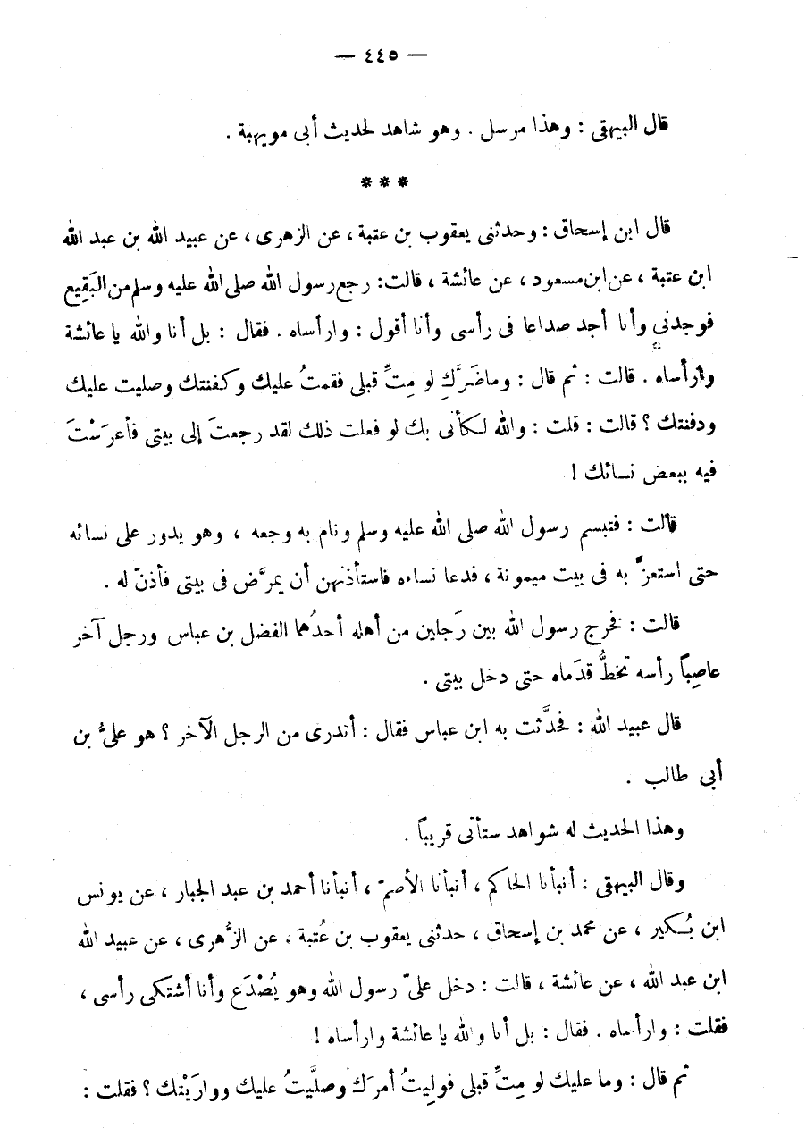 وَقَالَ الْبَيْهَقِيُّ: أَنْبَأَنَا الْحَاكِمُ، أَنْبَأَنَا الْأَصَمُّ، أَنْبَأَنَا أَحْمَدُ بْنُ عبد الْجَبَّار، عَن يُونُس ابْن بُكَيْرٍ، عَنْ مُحَمَّدُ بْنُ إِسْحَاقَ، حَدَّثَنِي يَعْقُوبُ بْنُ عُتْبَةَ، عَنِ الزُّهْرِيِّ، عَنْ عُبَيْدِ اللَّهِ ابْن عَبْدِ اللَّهِ، عَنْ عَائِشَةَ، قَالَتْ: دَخَلَ عَلَيَّ رَسُولُ اللَّهِ وَهُوَ يُصْدَعُ وَأَنَا أَشْتَكِي رَأْسِي، فَقُلْتُ: وَارَأْسَاهْ.