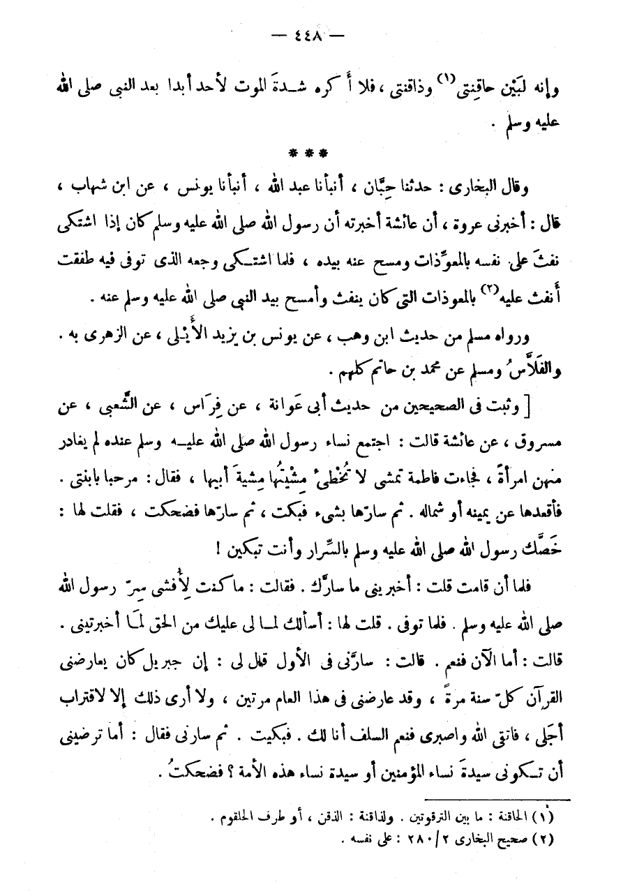ثُمَّ سَارَّهَا بشئ فَبَكَتْ، ثُمَّ سَارَّهَا فَضَحِكَتْ، فَقُلْتُ لَهَا: خَصَّكِ رَسُولُ اللَّهِ صَلَّى اللَّهُ عَلَيْهِ وَسَلَّمَ بِالسِّرَارِ وَأَنت تبكين! فَلَمَّا أَن قَامَت قلت: أَخْبِرِينِي مَا سَارَّكِ.