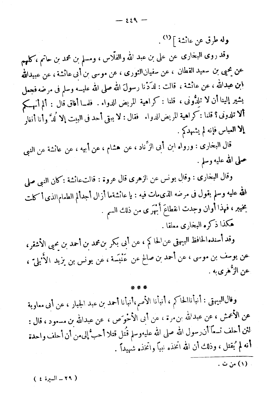 وَقَدْ رَوَى الْبُخَارِيُّ عَن على بن عبد الله وَالْفَلَّاس، وَمُسلم بن مُحَمَّدِ بْنِ حَاتِمٍ، كُلُّهُمْ عَنْ يَحْيَى بْنِ سَعِيدٍ الْقَطَّانِ، عَنْ سُفْيَانَ الثَّوْرِيِّ، عَنْ مُوسَى بن أَبى عَائِشَة، عَن عبيد الله ابْن عَبْدِ اللَّهِ، عَنْ عَائِشَةَ، قَالَتْ: لَدَدْنَا رَسُولَ اللَّهِ صَلَّى اللَّهُ عَلَيْهِ وَسَلَّمَ فِي مَرَضِهِ فَجعل يُشِير إِلَيْنَا أَنْ لَا تَلُدُّونِي، قُلْنَا: كَرَاهِيَةُ الْمَرِيضِ لِلدَّوَاءِ.