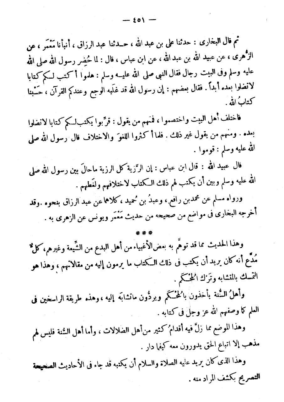 * * * وَهَذَا الْحَدِيثُ مِمَّا قَدْ تَوَهَّمَ بِهِ بَعْضُ الْأَغْبِيَاءِ مِنْ أَهْلِ الْبِدَعِ مِنَ الشِّيعَةِ وَغَيرهم، كل مُدع أَنَّهُ كَانَ يُرِيدُ أَنْ يَكْتُبَ فِي ذَلِكَ الْكتاب مَا يرْمونَ إِلَيْهِ مِنْ مَقَالَاتِهِمْ، وَهَذَا هُوَ التَّمَسُّكُ بِالْمُتَشَابِهِ وَتَرْكُ الْمُحْكَمِ.
