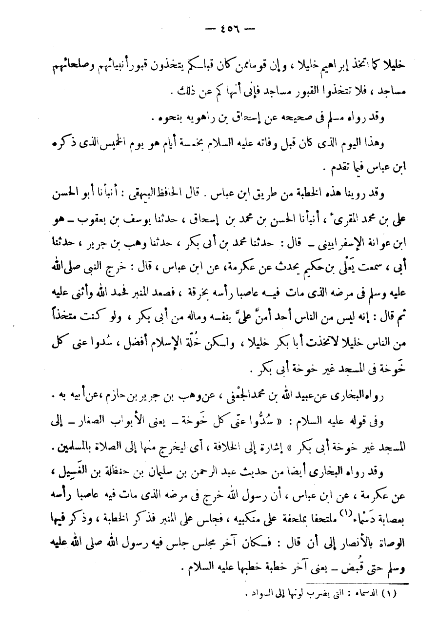 قَالَ الْحَافِظُ الْبَيْهَقِيُّ: أَنْبَأَنَا أَبُو الْحَسَنِ عَلِيُّ بْنُ مُحَمَّدٍ الْمُقْرِئُ، أَنْبَأَنَا الْحَسَنُ بْنُ مُحَمَّدِ بْنِ إِسْحَاقَ، حَدَّثَنَا يُوسُفُ بن يَعْقُوب - هُوَ ابْن عوَانَة الاسفرايينى - قَالَ: حَدثنَا مُحَمَّد بن أَبى بكر، حَدثنَا وهب بن جرير، حَدثنَا أَبِي، سَمِعْتُ يَعْلَى بْنَ حَكِيمٍ يُحَدِّثُ عَنْ عِكْرِمَةَ، عَنِ ابْنِ عَبَّاسٍ، قَالَ: خَرَجَ النَّبِيُّ صَلَّى اللَّهُ عَلَيْهِ وَسَلَّمَ فِي مَرَضِهِ الَّذِي مَاتَ فِيهِ عَاصِبًا رَأْسَهُ بِخِرْقَةٍ، فَصَعِدَ الْمِنْبَرَ فَحَمِدَ اللَّهَ وَأَثْنَى عَلَيْهِ ثُمَّ قَالَ: إِنَّهُ لَيْسَ مِنَ النَّاسِ أَحَدٌ أَمَنَّ عَلَيَّ بِنَفْسِهِ وَمَالِهِ مِنْ أَبِي بَكْرٍ، وَلَوْ كُنْتُ مُتَّخِذًا مِنَ النَّاسِ خَلِيلًا لَاتَّخَذْتُ أَبَا بَكْرٍ خَلِيلًا، وَلَكِنْ خُلَّةُ الْإِسْلَامِ أَفْضَلُ، سُدُّوا عَنِّي كُلَّ خَوْخَةٍ فِي الْمَسْجِدِ غَيْرَ خَوْخَةِ أَبِي بَكْرٍ.
