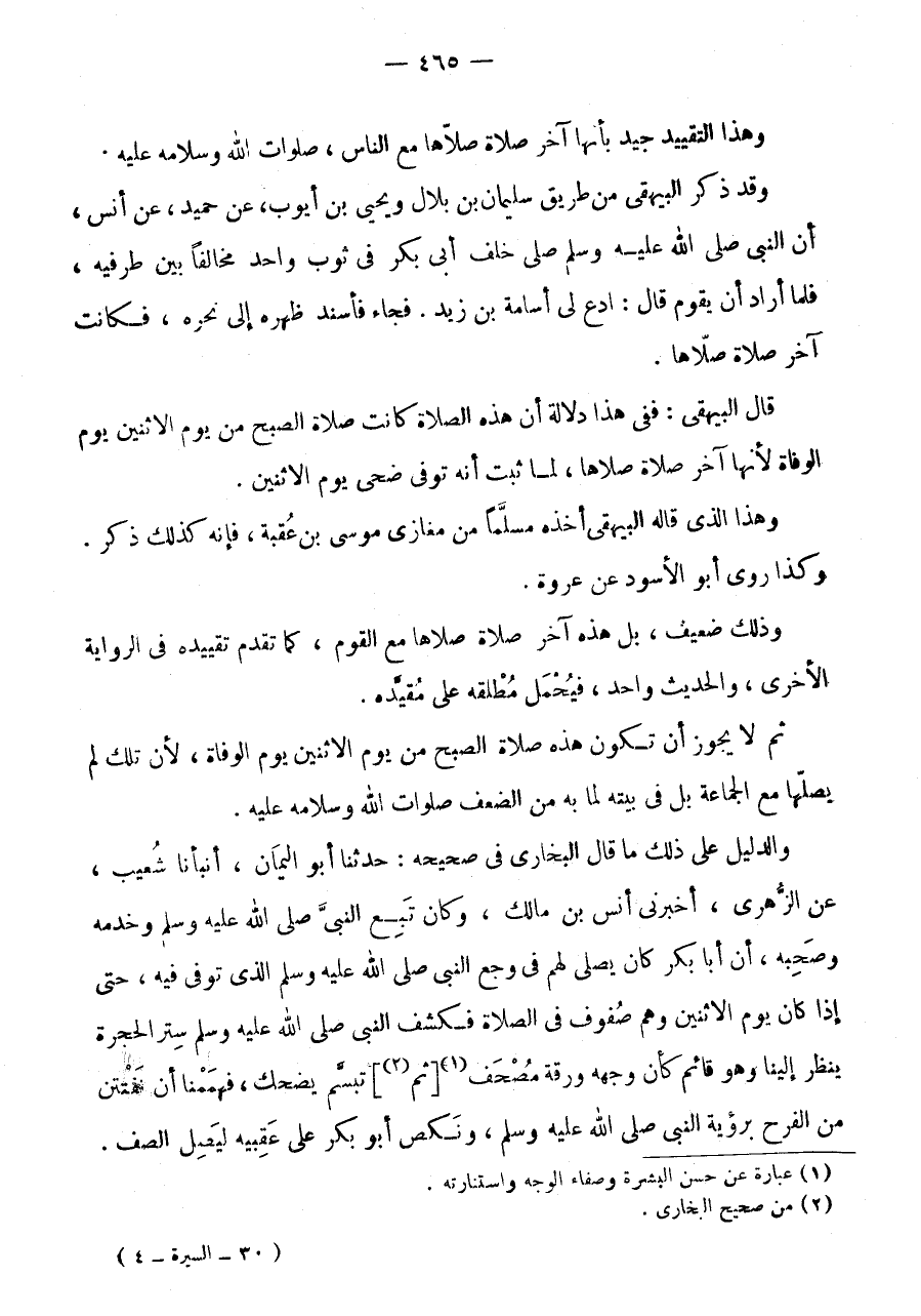 قَالَ الْبَيْهَقِيُّ: فَفِي هَذَا دَلَالَةٌ أَنَّ هَذِهِ الصَّلَاةَ كَانَتْ صَلَاةَ الصُّبْحِ مِنْ يَوْمِ الِاثْنَيْنِ يَوْمَ الْوَفَاةِ لِأَنَّهَا آخِرُ صَلَاةٍ صَلَّاهَا، لِمَا ثَبَتَ أَنَّهُ تُوُفِّيَ ضُحَى يَوْمِ الِاثْنَيْنِ.