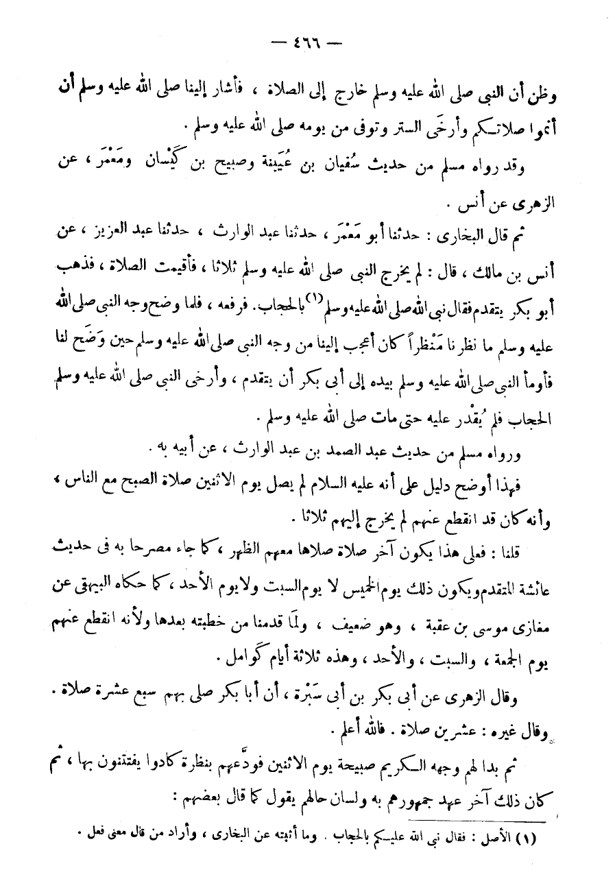 ثمَّ قَالَ الْبُخَارِيُّ: حَدَّثَنَا أَبُو مَعْمَرٍ، حَدَّثَنَا عَبْدُ الْوَارِثِ، حَدَّثَنَا عَبْدُ الْعَزِيزِ، عَنْ أَنَسِ بْنِ مَالِكٍ، قَالَ: لَمْ يَخْرُجِ النَّبِيُّ صَلَّى اللَّهُ عَلَيْهِ وَسَلَّمَ ثَلَاثًا، فَأُقِيمَتِ الصَّلَاةُ، فَذَهَبَ أَبُو بَكْرٍ يَتَقَدَّمُ فَقَالَ نبى الله صلى الله عَلَيْهِ وَسلم (1) بِالْحِجَابِ.
