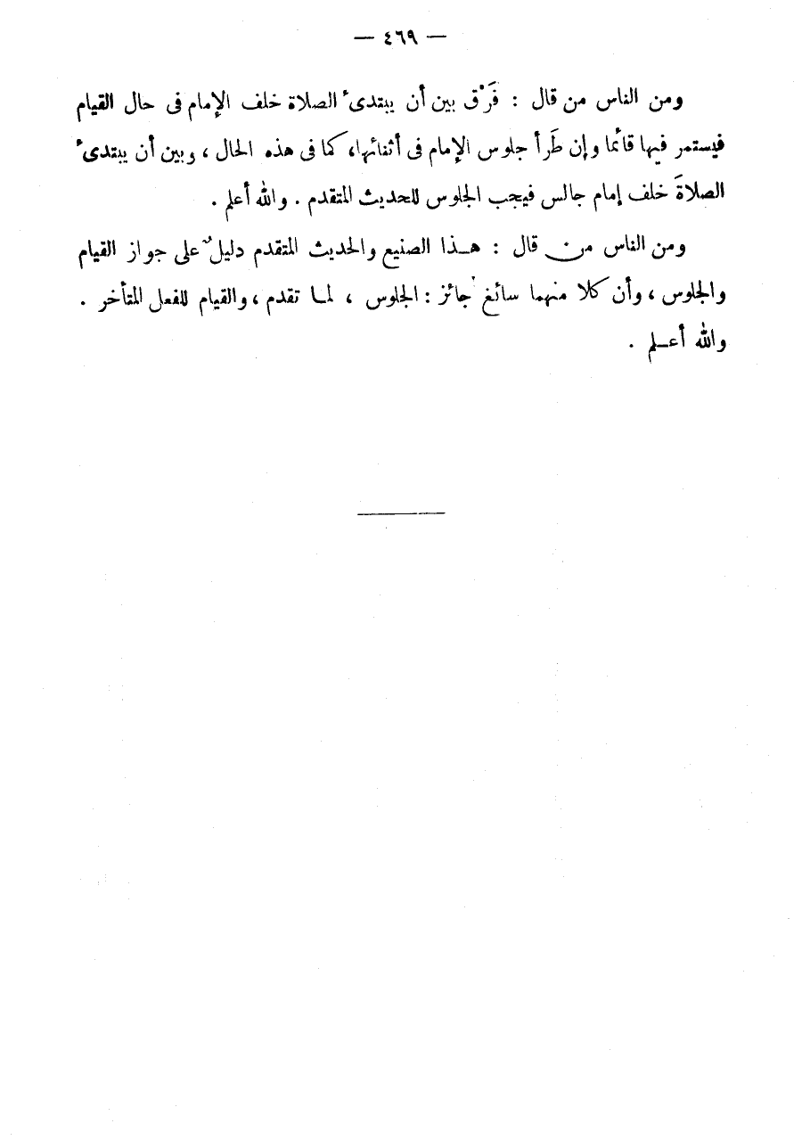 وَمِنَ النَّاسِ مَنْ قَالَ: فَرْقٌ بَيْنَ أَنْ يَبْتَدِئَ الصَّلَاةَ خَلْفَ الْإِمَامِ فِي حَالِ الْقِيَامِ فَيَسْتَمِرَّ فِيهَا قَائِمًا وَإِنْ طَرَأَ جُلُوسُ الْإِمَامِ فِي أَثْنَائِهَا، كَمَا فِي هَذِهِ الْحَالِ، وَبَيْنَ أَنْ يَبْتَدِئَ الصَّلَاةَ خَلْفَ إِمَامٍ جَالِسٍ فَيَجِبُ الْجُلُوسُ لِلْحَدِيثِ الْمُتَقَدِّمِ.