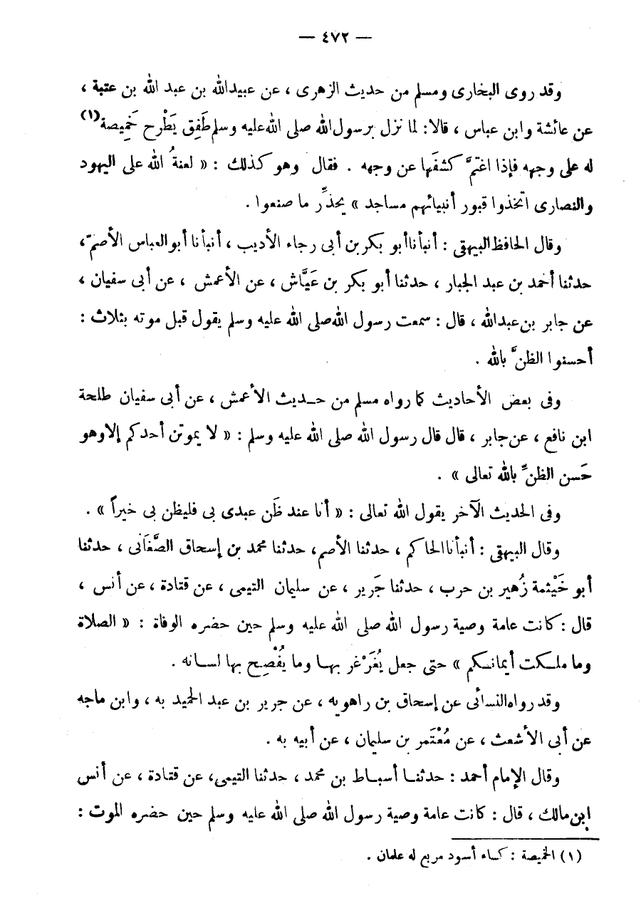 وَقَدْ رَوَى الْبُخَارِيُّ وَمُسْلِمٌ مِنْ حَدِيثِ الزُّهْرِيِّ، عَنْ عُبَيْدِ اللَّهِ بْنِ عَبْدِ اللَّهِ بْنِ عُتْبَةَ، عَنْ عَائِشَةَ وَابْنَ عَبَّاسٍ، قَالَا: لَمَّا نُزِلَ بِرَسُولِ اللَّهِ صَلَّى اللَّهُ عَلَيْهِ وَسَلَّمَ طَفِقَ يَطْرَحُ خَمِيصَةً (1) لَهُ عَلَى وَجْهِهِ فَاذَا اغْتَمَّ كَشَفَهَا عَنْ وَجْهِهِ.