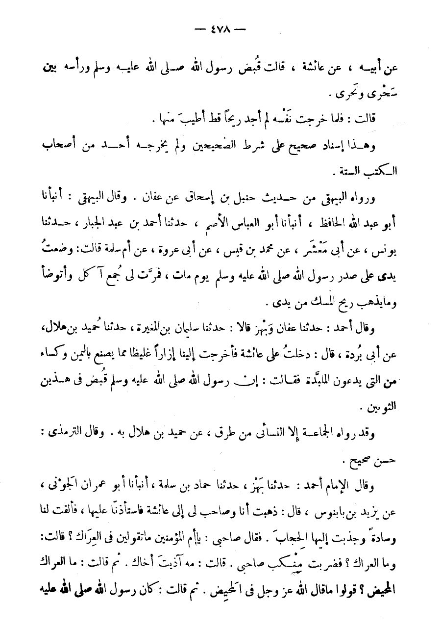 عَنْ أَبِي بُرْدَةَ، قَالَ: دَخَلْتُ عَلَى عَائِشَة فأخرجت إِلَيْنَا إزارا غليظا مِمَّا يصنع بِالْيَمَنِ وَكِسَاءً مِنَ الَّتِي يَدْعُونَ الْمُلَبَّدَةَ فَقَالَتْ: أَنَّ رَسُولَ اللَّهِ صَلَّى اللَّهُ عَلَيْهِ وَسَلَّمَ قُبِضَ فِي هَذَيْنِ الثَّوْبَيْنِ.
