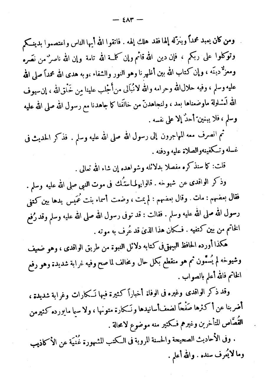 وَقَدْ ذَكَرَ الْوَاقِدِيُّ وَغَيْرُهُ فِي الْوَفَاةِ أَخْبَارًا كَثِيرَةً فِيهَا نَكَارَاتٌ وَغَرَابَةٌ شَدِيدَةٌ، أَضْرَبْنَا عَنْ أَكْثَرِهَا صَفْحًا لِضَعْفِ أَسَانِيدِهَا وَنَكَارَةِ مُتُونِهَا، وَلَا سِيَّمَا مَا يُورِدُهُ كَثِيرٌ مِنَ الْقُصَّاصِ الْمُتَأَخِّرِينَ وَغَيْرُهُمْ فَكَثِيرٌ مِنْهُ مَوْضُوعٌ لَا محَالة.