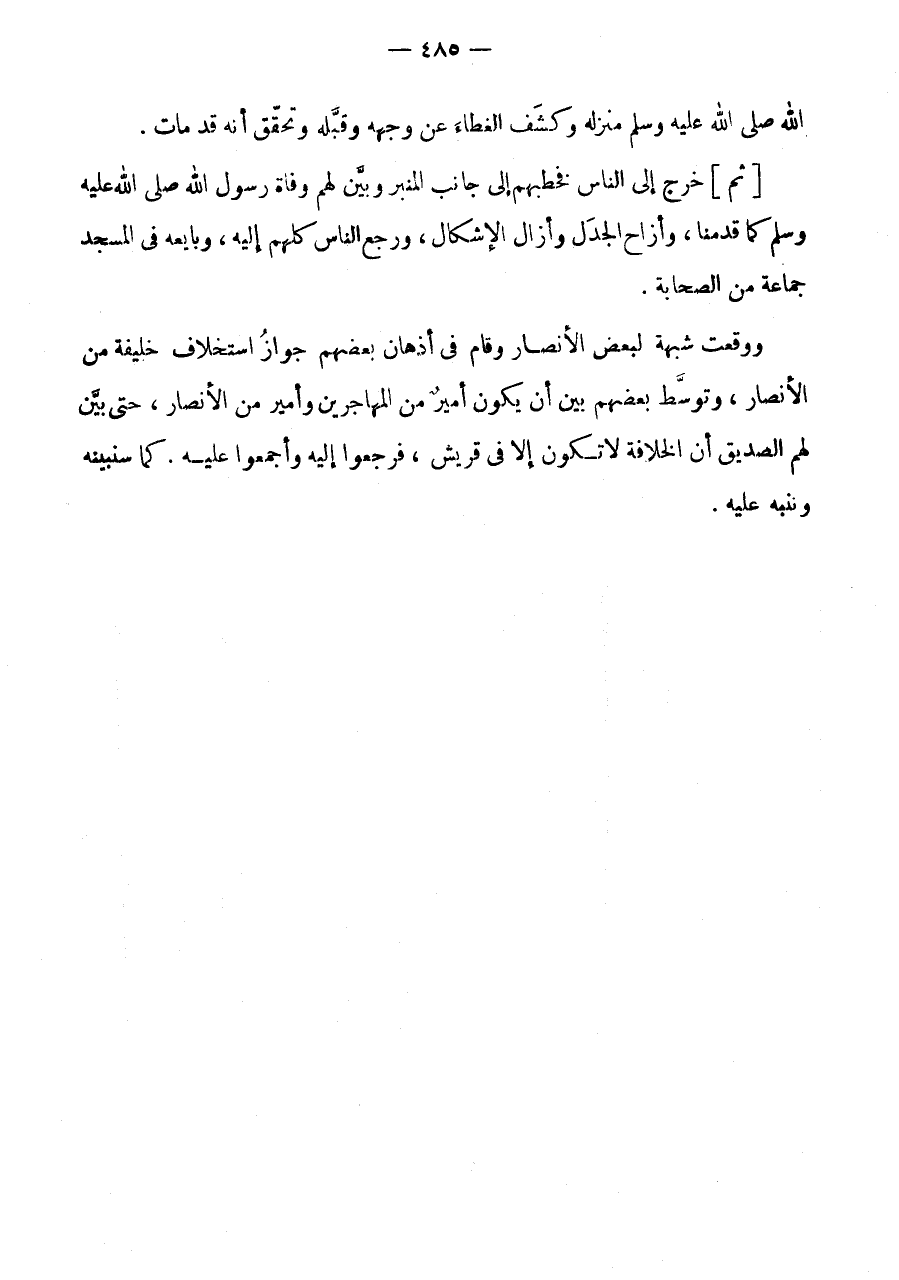 وَوَقَعَتْ شُبْهَةٌ لِبَعْضِ الْأَنْصَارِ وَقَامَ فِي أَذْهَانِ بَعْضِهِمْ جَوَازُ اسْتِخْلَافِ خَلِيفَةٍ مِنَ الْأَنْصَارِ، وَتَوَسَّطَ بَعْضُهُمْ بَيْنَ أَنْ يَكُونَ أَمِيرٌ مِنَ الْمُهَاجِرِينَ وَأَمِيرٌ مِنَ الْأَنْصَارِ، حَتَّى بَيَّنَ لَهُمُ الصِّدِّيقُ أَنَّ الْخِلَافَةَ لَا تَكُونُ إِلَّا فِي قُرَيْشٍ، فَرَجَعُوا إِلَيْهِ وَأَجْمَعُوا عَلَيْهِ.