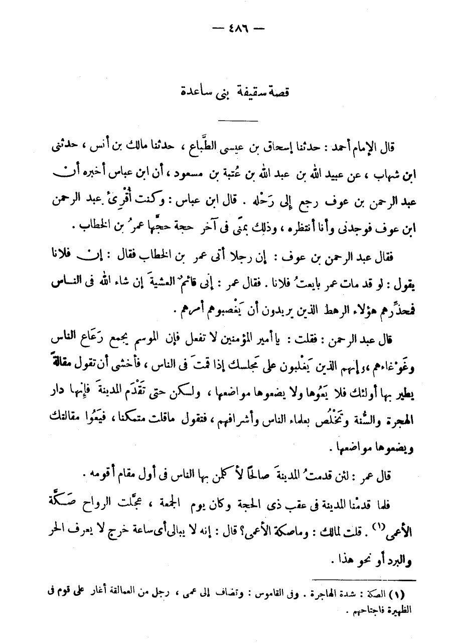 قِصَّةُ سَقِيفَةِ بَنِي سَاعِدَةَ قَالَ الْإِمَامُ أَحْمَدُ: حَدَّثَنَا إِسْحَاقُ بْنُ عِيسَى الطباع، حَدثنَا مَالِكُ بْنُ أَنَسٍ، حَدَّثَنِي ابْنِ شِهَابٍ، عَنْ عُبَيْدِ اللَّهِ بْنِ عَبْدِ اللَّهِ بْنِ عُتْبَةَ بْنِ مَسْعُودٍ، أَنَّ ابْنَ عَبَّاسٍ أَخْبَرَهُ أَنَّ عَبْدَ الرَّحْمَنِ بْنَ عَوْفٍ رَجَعَ إِلَى رَحْلِهِ.