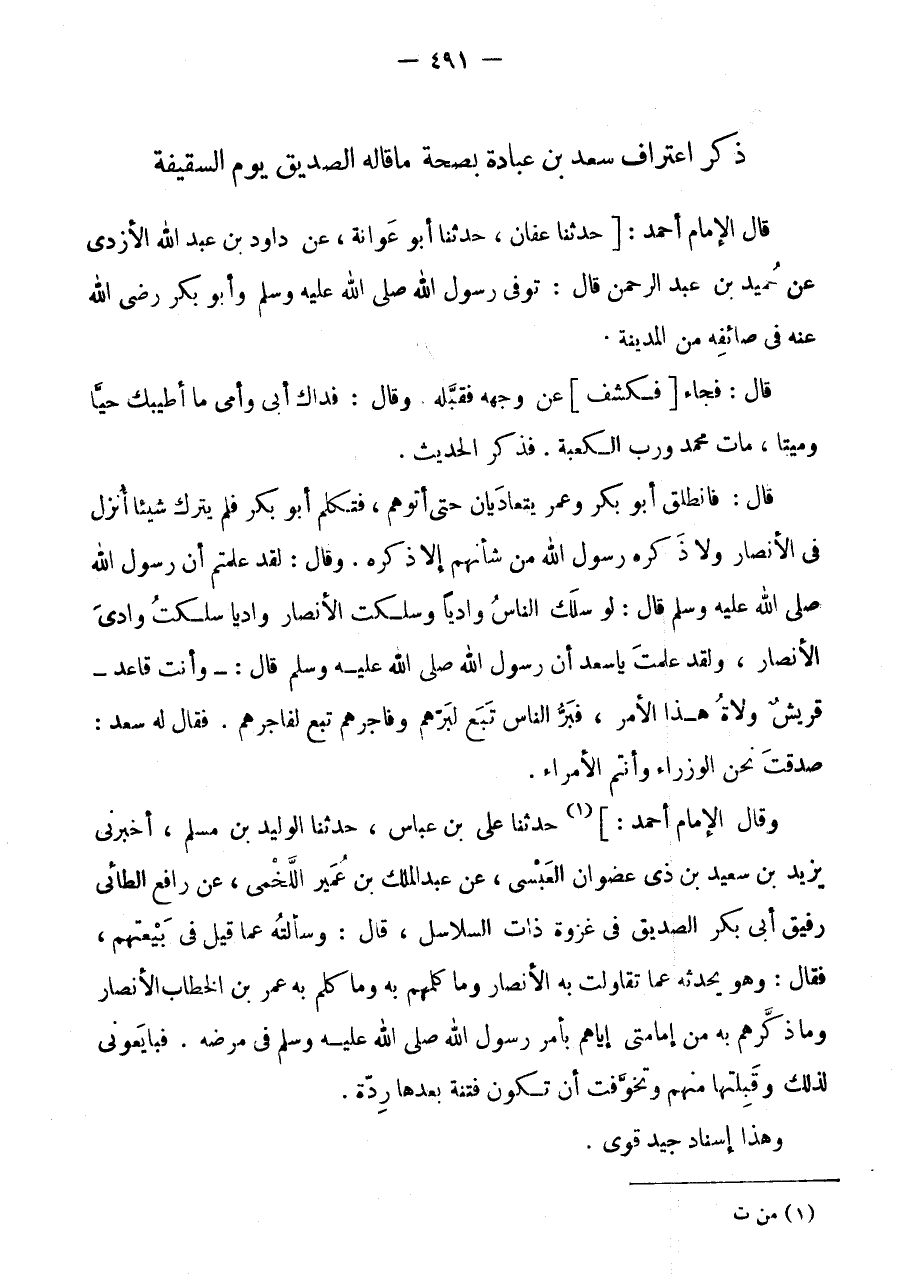 وَقَالَ الْإِمَامُ أَحْمَدُ:] (1) حَدَّثَنَا عَلِيُّ بن عَبَّاس، حَدثنَا الْوَلِيدُ بْنُ مُسْلِمٍ، أَخْبَرَنِي يَزِيدُ بْنُ سَعِيدِ بن ذى عضوان الْعَبْسِيُّ، عَنْ عَبْدِ الْمَلِكِ بْنِ عُمَيْرٍ اللَّخْمِيِّ، عَنْ رَافِعٍ الطَّائِيِّ رَفِيقِ أَبِي بَكْرٍ الصِّدِّيقِ فِي غَزْوَةِ ذَاتِ السَّلَاسِلِ، قَالَ: وَسَأَلْتُهُ عَمَّا قِيلَ فِي بَيْعَتِهِمْ، فَقَالَ: وَهُوَ يُحَدِّثُهُ عَمَّا تَقَاوَلَتْ بِهِ الْأَنْصَارُ وَمَا كَلَّمَهُمْ بِهِ وَمَا كَلَّمَ بِهِ عُمَرُ بْنُ الْخَطَّابِ الْأَنْصَارَ وَمَا ذكرهم بِهِ من إِمَّا مَتى إِيَّاهُمْ بِأَمْرِ رَسُولِ اللَّهِ صَلَّى اللَّهُ عَلَيْهِ وَسَلَّمَ فِي مَرَضِهِ.