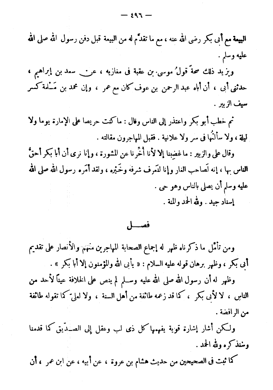 الْبَيْعَةَ مَعَ أَبِي بَكْرٍ رَضِيَ اللَّهُ عَنْهُ، مَعَ مَا تَقَدَّمَ لَهُ مِنَ الْبَيْعَةِ قَبْلَ دَفْنِ رَسُولِ اللَّهِ صَلَّى اللَّهُ عَلَيْهِ وَسَلَّمَ.