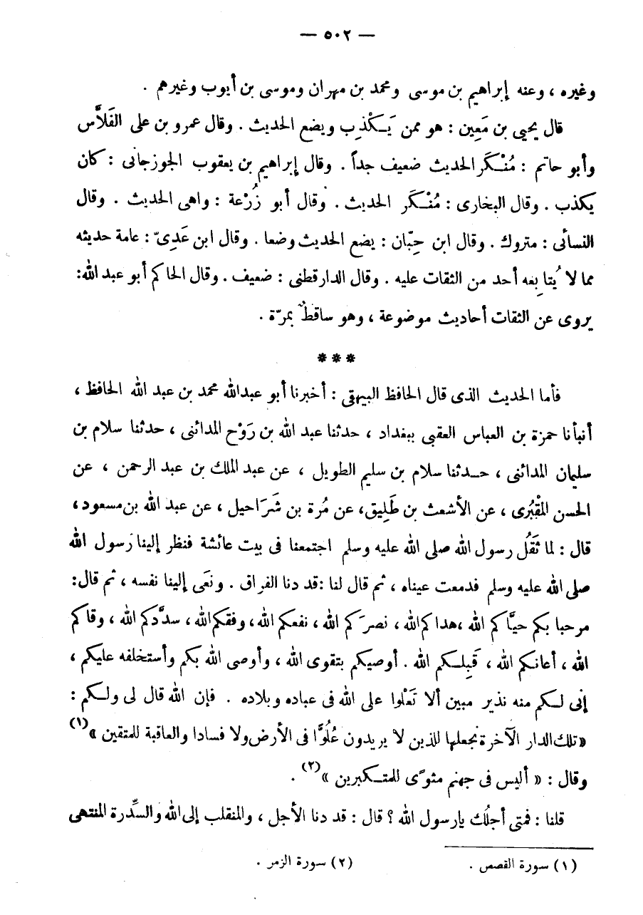 فَأَمَّا الْحَدِيثُ الَّذِي قَالَ الْحَافِظُ الْبَيْهَقِيُّ: أَخْبَرَنَا أَبُو عَبْدِ اللَّهِ مُحَمَّدُ بْنُ عَبْدِ اللَّهِ الْحَافِظُ، أَنْبَأَنَا حَمْزَةُ بْنُ الْعَبَّاسِ الْعَقِبِيُّ بِبَغْدَاد، حَدثنَا عبد الله بن روح الْمَدَائِنِي، حَدثنَا سَلام بن سُلَيْمَان الْمَدَائِنِي، حَدثنَا سَلَّامُ بْنُ سُلَيْمٍ الطَّوِيلُ، عَنْ عَبْدِ الْمَلِكِ بن عبد الرَّحْمَن، عَن الْحسن المقبرى، عَنِ الْأَشْعَثِ بْنِ طَلِيقٍ، عَنْ مُرَّةَ بْنِ شَرَاحِيلَ، عَنْ عَبْدِ اللَّهِ بْنِ مَسْعُودٍ، قَالَ: لَمَّا ثَقُلَ رَسُولُ اللَّهِ صَلَّى اللَّهُ عَلَيْهِ وَسَلَّمَ اجْتَمَعْنَا فِي بَيْتِ عَائِشَةَ فَنَظَرَ إِلَيْنَا رَسُولُ اللَّهِ صَلَّى اللَّهُ عَلَيْهِ وَسَلَّمَ فَدَمَعَتْ عَيْنَاهُ، ثُمَّ قَالَ لَنَا: قَدْ دَنَا الْفِرَاقُ.