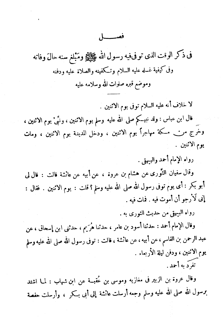 فُصْلٌ فِي ذِكْرِ الْوَقْتِ الَّذِي تُوُفِّيَ فِيهِ رَسُولُ اللَّهِ صَلَّى اللَّهُ عَلَيْهِ وَسَلَّمَ وَمَبْلَغِ سنه حَال وَفَاته وفى كَيْفيَّة غسله عَلَيْهِ السَّلَام وَتَكْفِينِهِ وَالصَّلَاةِ عَلَيْهِ وَدَفْنِهِ وَمَوْضِعِ قَبْرِهِ صَلَوَاتُ اللَّهِ وَسَلَامُهُ عَلَيْهِ لَا خِلَافَ أَنَّهُ عَلَيْهِ السَّلَام تُوُفِّيَ يَوْمَ الِاثْنَيْنِ.