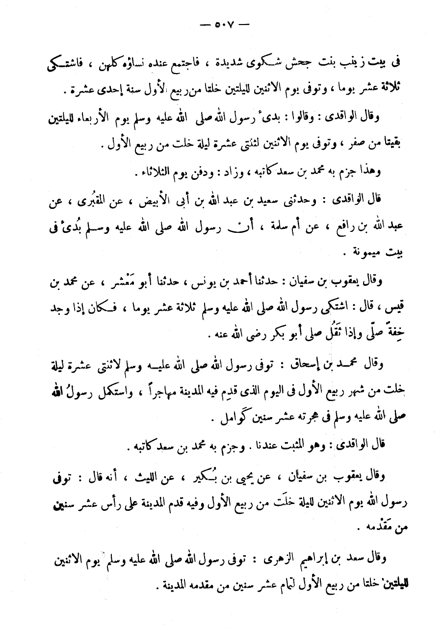 وَقَالَ الْوَاقِدِيُّ: وَقَالُوا: بُدِئَ رَسُولُ اللَّهِ صَلَّى اللَّهُ عَلَيْهِ وَسَلَّمَ يَوْمَ الْأَرْبِعَاءِ لِلَيْلَتَيْنِ بَقِيَتَا مِنْ صَفَرٍ، وَتُوُفِّيَ يَوْمَ الِاثْنَيْنِ لِثِنْتَيْ عَشْرَةَ لَيْلَةً خَلَتْ مِنْ رَبِيعٍ الْأَوَّلِ.