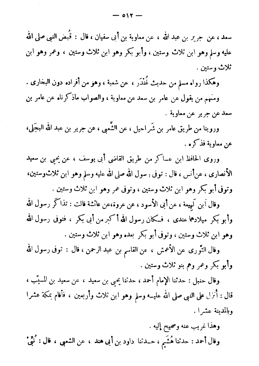 سَعْدٍ، عَنْ جَرِيرِ بْنِ عَبْدِ اللَّهِ، عَنْ مُعَاوِيَةَ بْنِ أَبِي سُفْيَانَ، قَالَ: قُبِضَ النَّبِيِّ صَلَّى اللَّهُ عَلَيْهِ وَسَلَّمَ وَهُوَ ابْنُ ثَلَاثٍ وَسِتِّينَ، وَأَبُو بَكْرٍ وَهُوَ ابْنُ ثَلَاثٍ وَسِتِّينَ، وَعُمَرُ وَهُوَ ابْنُ ثَلَاثٍ وَسِتِّينَ.