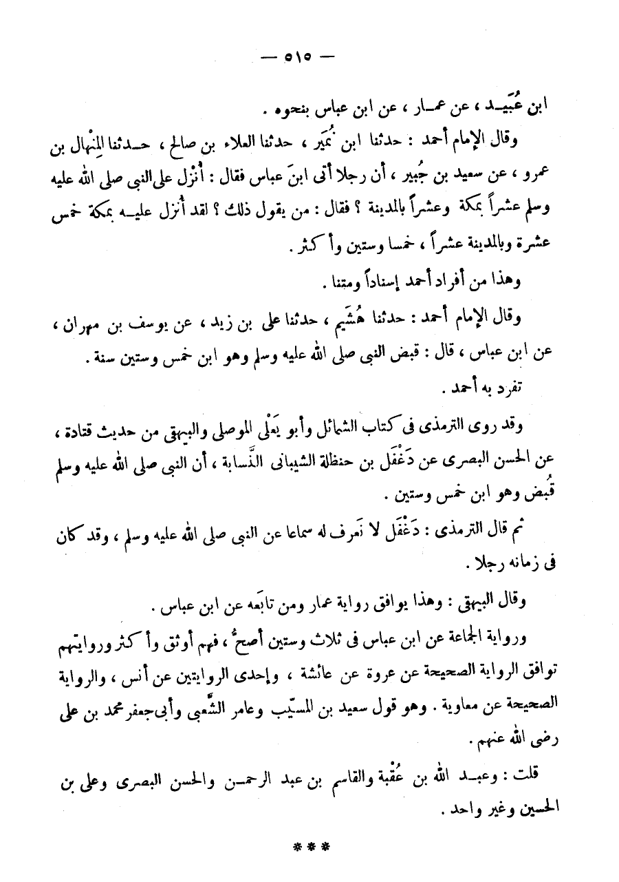 وَقَالَ الْإِمَامُ أَحْمَدُ: حَدَّثَنَا ابْنُ نُمَيْرٍ، حَدَّثَنَا الْعَلَاء بن صَالح، حَدثنَا الْمِنْهَالِ بْنِ عَمْرٍو، عَنْ سَعِيدِ بْنِ جُبَيْرٍ، أَنَّ رَجُلًا أَتَى ابْنَ عَبَّاسٍ فَقَالَ: أُنْزِلَ عَلَى النَّبِيِّ صَلَّى اللَّهُ عَلَيْهِ وَسَلَّمَ عَشْرًا بِمَكَّةَ وَعَشْرًا بِالْمَدِينَةِ؟ فَقَالَ: مَنْ يَقُولُ ذَلِكَ؟ لَقَدْ أُنْزِلَ عَلَيْهِ بِمَكَّةَ خَمْسَ عَشْرَةَ وَبِالْمَدِينَةِ عَشْرًا، خَمْسًا وَسِتِّينَ وَأَكْثَرَ.