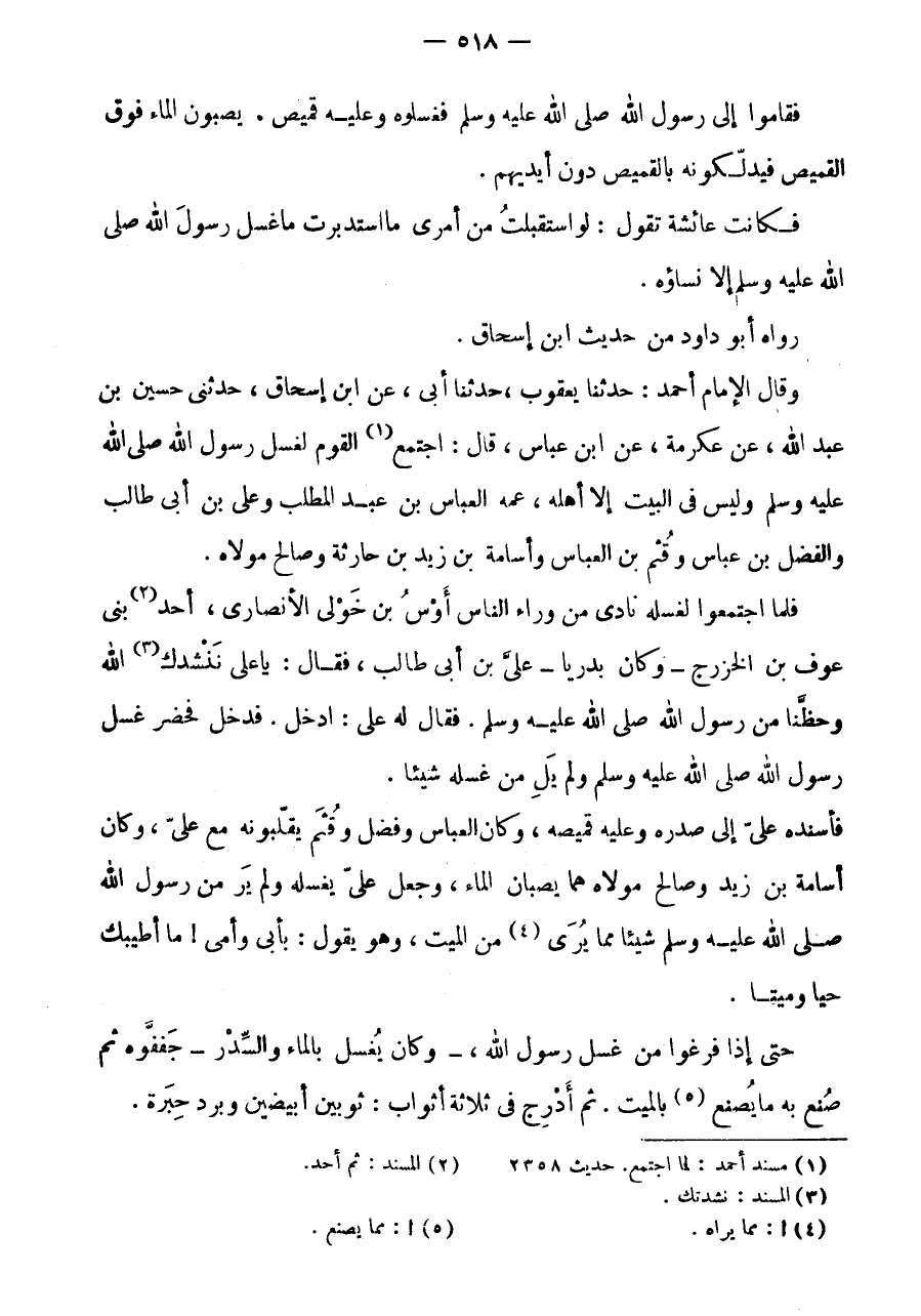 وَقَالَ الْإِمَامُ أَحْمَدُ: حَدَّثَنَا يَعْقُوبُ، حَدَّثَنَا أَبِي، عَنِ ابْنِ إِسْحَاقَ، حَدَّثَنِي حُسَيْنُ بْنُ عَبْدِ اللَّهِ، عَنْ عِكْرِمَةَ، عَنِ ابْنِ عَبَّاسٍ، قَالَ: اجْتَمَعَ (1) الْقَوْمُ لِغَسْلِ رَسُولُ اللَّهِ صَلَّى اللَّهُ عَلَيْهِ وَسَلَّمَ وَلَيْسَ فِي الْبَيْتِ إِلَّا أَهْلُهُ، عَمُّهُ الْعَبَّاسُ بْنُ عَبْدِ الْمُطَّلِبِ وَعَلِيُّ بْنُ أَبِي طَالِبٍ وَالْفَضْلُ بْنُ عَبَّاسٍ وَقُثَمُ بْنُ الْعَبَّاسِ وَأُسَامَةُ بْنُ زَيْدِ بْنِ حَارِثَةَ وَصَالِحٌ مَوْلَاهُ.