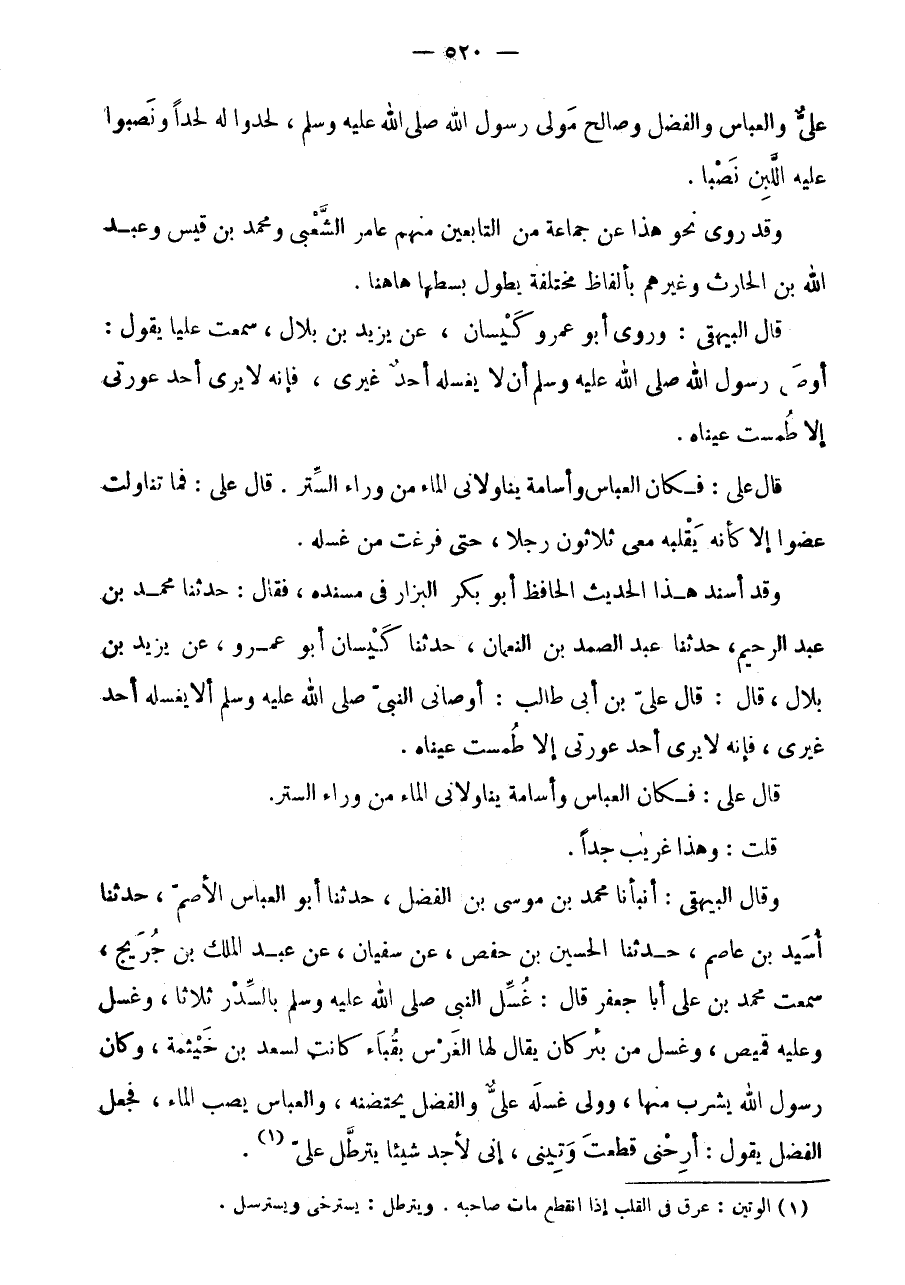 وَقَدْ أَسْنَدَ هَذَا الْحَدِيثَ الْحَافِظُ أَبُو بَكْرٍ الْبَزَّارُ فِي مُسْنَدِهِ، فَقَالَ: حَدَّثَنَا مُحَمَّدُ بن عبد الرَّحِيم، حَدثنَا عبد الصَّمد بن النُّعْمَان، حَدثنَا كَيْسَانُ أَبُو عَمْرٍو، عَنْ يَزِيدَ بْنِ بِلَالٍ، قَالَ: قَالَ على بن أَبى طَالب: أَوْصَانِي النَّبِي صلى الله عَلَيْهِ وَسلم أَلا يُغَسِّلَهُ أَحَدٌ غَيْرِي، فَإِنَّهُ لَا يَرَى أَحَدٌ عَوْرَتِي إِلَّا طُمِسَتْ عَيْنَاهُ.