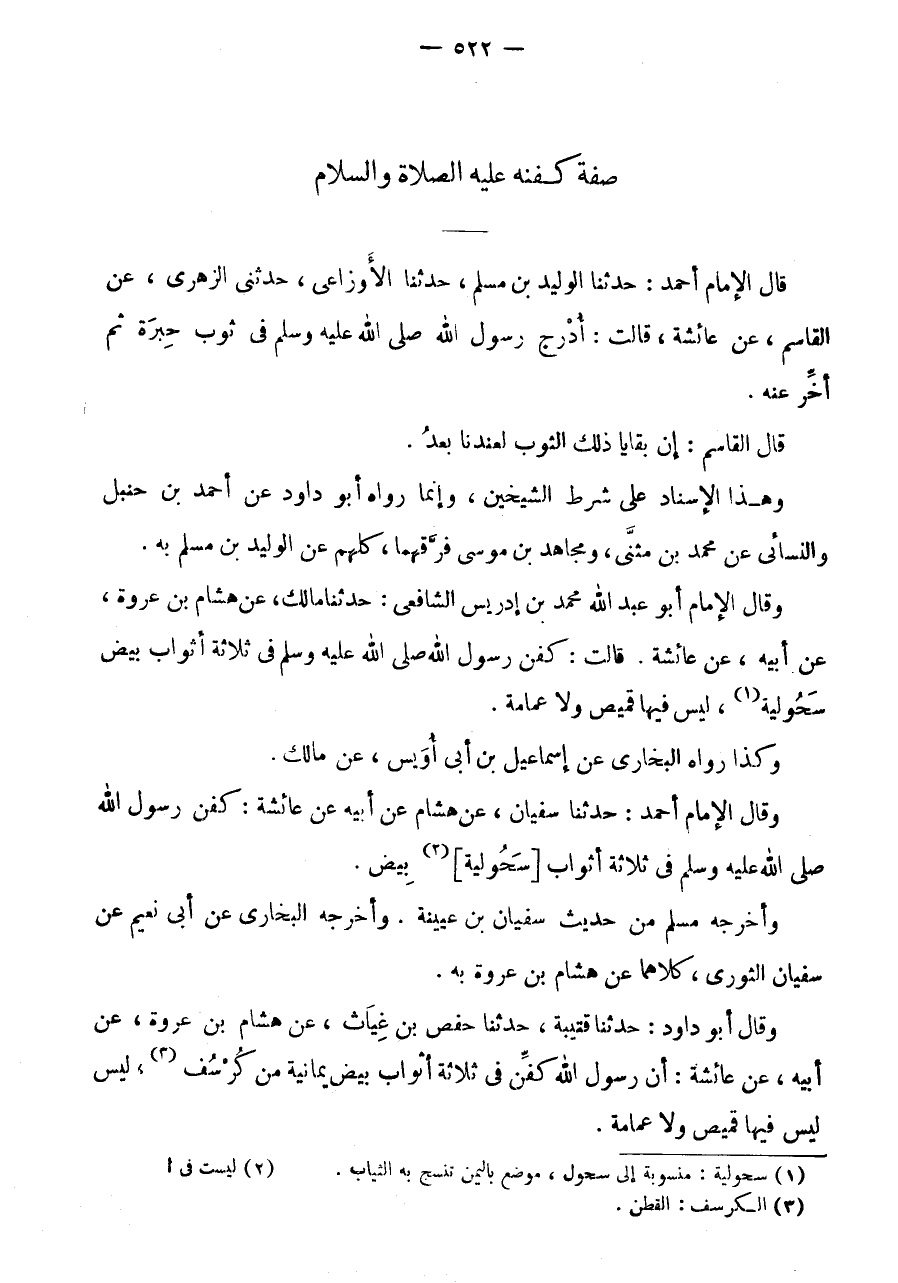 صِفَةِ كَفَنِهِ عَلَيْهِ الصَّلَاةُ وَالسَّلَامُ قَالَ الْإِمَامُ أَحْمَدُ: حَدَّثَنَا الْوَلِيدُ بْنُ مُسْلِمٍ، حَدثنَا الْأَوْزَاعِيُّ، حَدَّثَنِي الزُّهْرِيُّ، عَنِ الْقَاسِمِ، عَنْ عَائِشَةَ، قَالَتْ: أُدْرِجَ رَسُولُ اللَّهِ صَلَّى اللَّهُ عَلَيْهِ وَسلم فِي ثوب حبرَة ثمَّ أخر عَنْهُ.