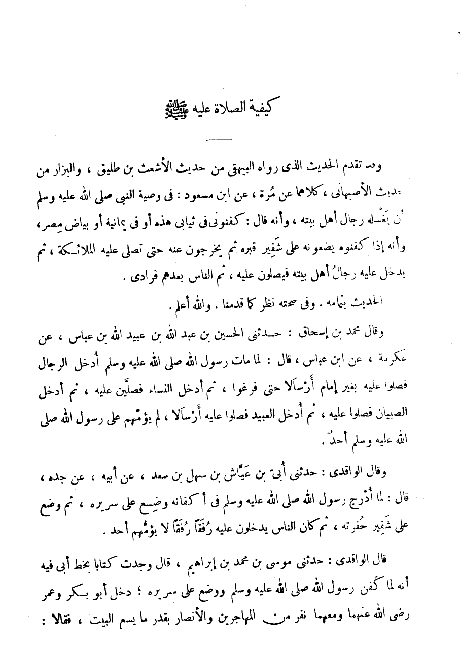 كَيْفِيَّةِ الصَّلَاةِ عَلَيْهِ صَلَّى اللَّهُ عَلَيْهِ وَسَلَّمَ وَقَدْ تَقَدَّمَ الْحَدِيثُ الَّذِي رَوَاهُ الْبَيْهَقِيُّ مِنْ حَدِيثِ الْأَشْعَثِ بْنِ طَلِيقٍ، وَالْبَزَّارُ مِنْ حَدِيثِ الْأَصْبَهَانِيِّ، كِلَاهُمَا عَنْ مُرَّةَ، عَنِ ابْنِ مَسْعُودٍ: فِي وَصِيَّةِ النَّبِيِّ صَلَّى اللَّهُ عَلَيْهِ وَسَلَّمَ أَنْ يُغَسِّلَهُ رِجَالُ أَهْلِ بَيْتِهِ، وَأَنَّهُ قَالَ: كفنوني فِي ثِيَابِي هَذِه أَو فِي يَمَانِية أَوْ بَيَاضِ مِصْرَ، وَأَنَّهُ إِذَا كَفَّنُوهُ يَضَعُونَهُ عَلَى شَفِيرِ قَبْرِهِ ثُمَّ يَخْرُجُونَ عَنْهُ حَتَّى تُصَلِّيَ عَلَيْهِ الْمَلَائِكَةُ، ثُمَّ يَدْخُلُ عَلَيْهِ رِجَالُ أَهْلِ بَيْتِهِ فَيُصَلُّونَ عَلَيْهِ، ثُمَّ النَّاسُ بَعْدَهُمْ فُرَادَى.