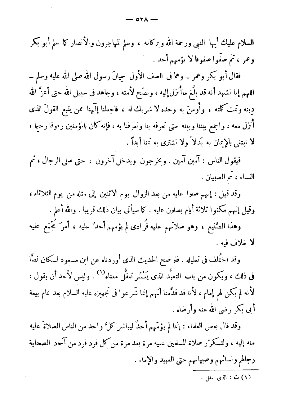 السَّلَامُ عَلَيْكَ أَيُّهَا النَّبِيُّ وَرَحْمَةُ اللَّهِ وَبَرَكَاتُهُ، وَسَلَّمَ الْمُهَاجِرُونَ وَالْأَنْصَارُ كَمَا سَلَّمَ أَبُو بَكْرٍ وَعُمَرُ، ثُمَّ صُفُّوا صُفُوفًا لَا يَؤُمُّهُمْ أَحَدٌ.
