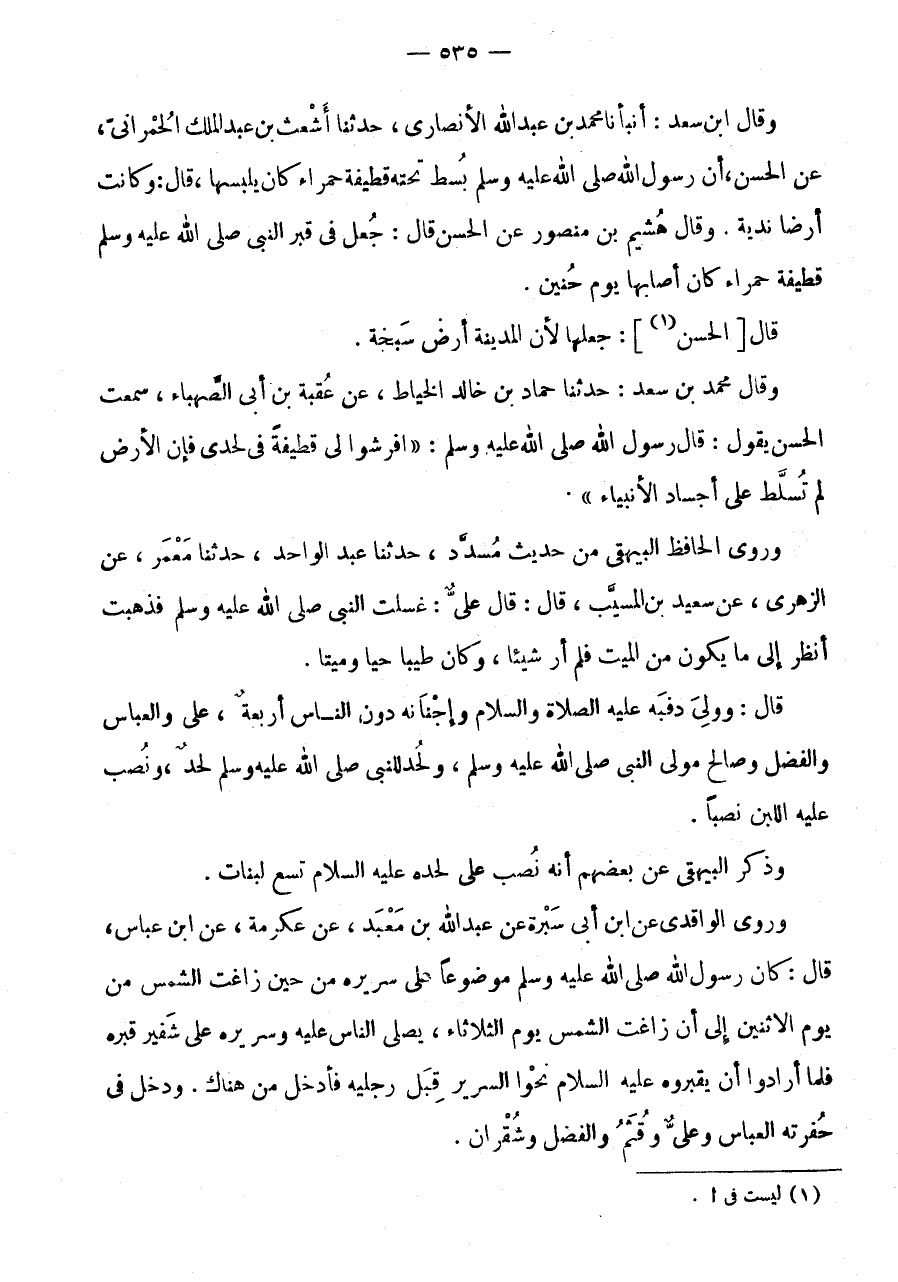 وَقَالَ مُحَمَّد بن سعد: حَدثنَا حَمَّادُ بْنُ خَالِدٍ الْخَيَّاطُ، عَنْ عُقْبَةَ بْنِ أَبِي الصَّهْبَاءِ، سَمِعْتُ الْحَسَنَ يَقُولُ: قَالَ رَسُولُ اللَّهِ صَلَّى اللَّهُ عَلَيْهِ وَسَلَّمَ: " افْرِشُوا لِي قطيفة فِي لَحْدِي فَإِنَّ الْأَرْضَ لَمْ تُسَلَّطْ عَلَى أَجْسَادِ الْأَنْبِيَاءِ ".