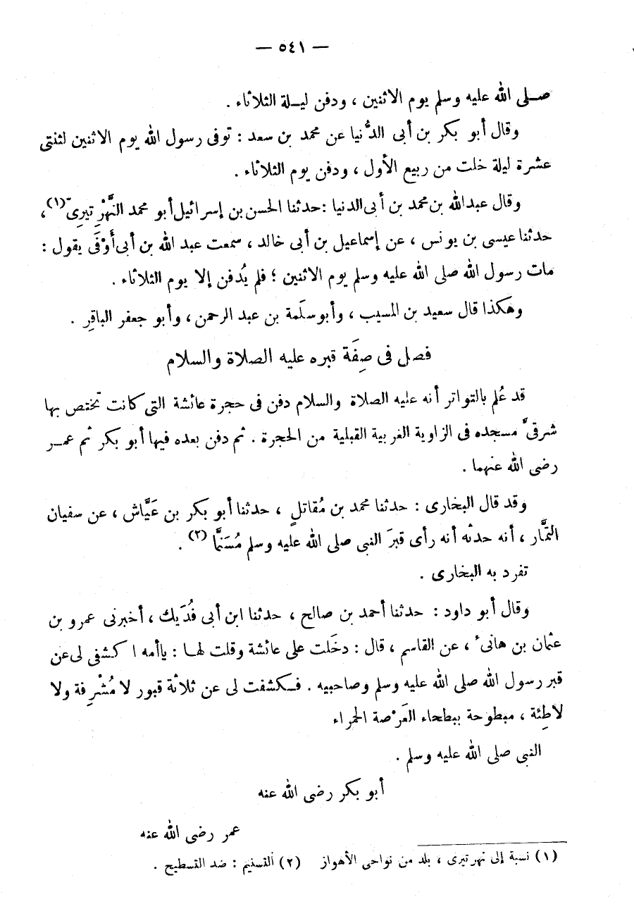 فَصْلٌ فِي صِفَةِ قَبْرِهِ عَلَيْهِ الصَّلَاةُ وَالسَّلَامُ قَدْ عُلِمَ بِالتَّوَاتُرِ أَنَّهُ عَلَيْهِ الصَّلَاةُ وَالسَّلَامُ دُفِنَ فِي حُجْرَةِ عَائِشَةَ الَّتِي كَانَتْ تَخْتَصُّ بِهَا شَرْقِيَّ مَسْجِدِهِ فِي الزَّاوِيَةِ الْغَرْبِيَّةِ الْقِبْلِيَّةِ مِنَ الْحُجْرَةِ.