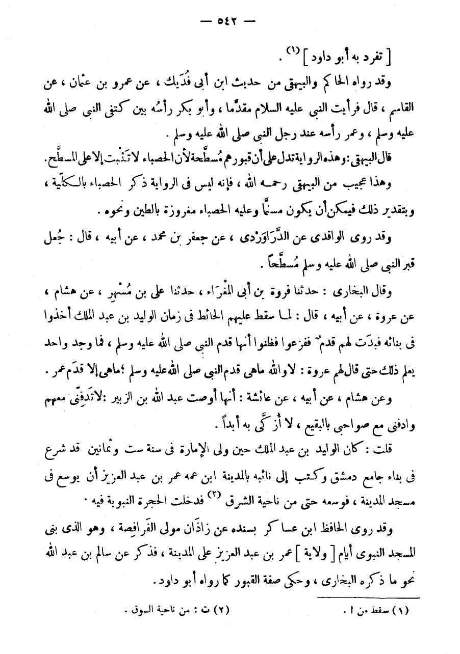 وَقَدْ رَوَى الْحَافِظُ ابْنُ عَسَاكِرَ بِسَنَدِهِ عَنْ زَاذَانَ مَوْلَى الْفُرَافِصَةِ، وَهُوَ الَّذِي بَنَى الْمَسْجِدَ النَّبَوِيَّ أَيَّامَ [وِلَايَةِ] عُمَرَ بْنِ عَبْدِ الْعَزِيزِ عَلَى الْمَدِينَةِ، فَذَكَرَ عَنْ سَالِمِ بْنِ عَبْدِ اللَّهِ نَحْوَ مَا ذَكَرَهُ الْبُخَارِيُّ، وَحَكَى صِفَةَ الْقُبُور كَمَا رَوَاهُ أَبُو دَاوُد.