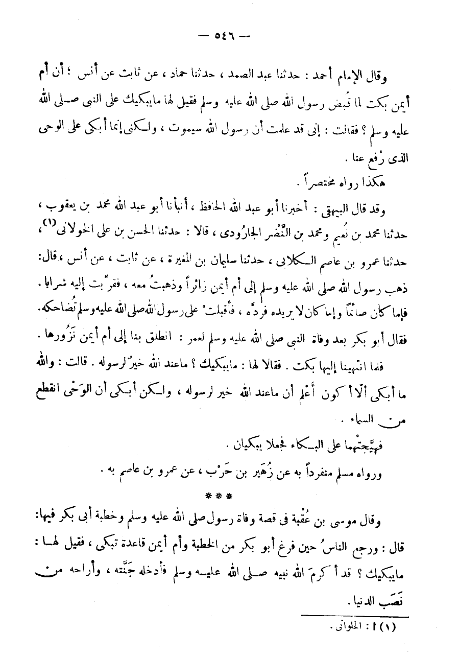 وَقَالَ الْإِمَامُ أَحْمَدُ: حَدَّثَنَا عَبْدُ الصَّمَدِ، حَدَّثَنَا حَمَّادٌ، عَنْ ثَابِتٍ عَنْ أَنَسٍ ; أَنَّ أُمَّ أَيْمَنَ بَكَتْ لَمَّا قُبِضَ رَسُولُ اللَّهِ صَلَّى اللَّهُ عَلَيْهِ وَسَلَّمَ فَقِيلَ لَهَا مَا يُبْكِيكِ عَلَى النَّبِيِّ صَلَّى اللَّهُ عَلَيْهِ وَسَلَّمَ؟ فَقَالَتْ: إِن قد علمت أَن رَسُول الله سَيَمُوتُ، وَلَكِنِّي إِنَّمَا أَبْكِي عَلَى الْوَحْيِ الَّذِي رُفِعَ عَنَّا.