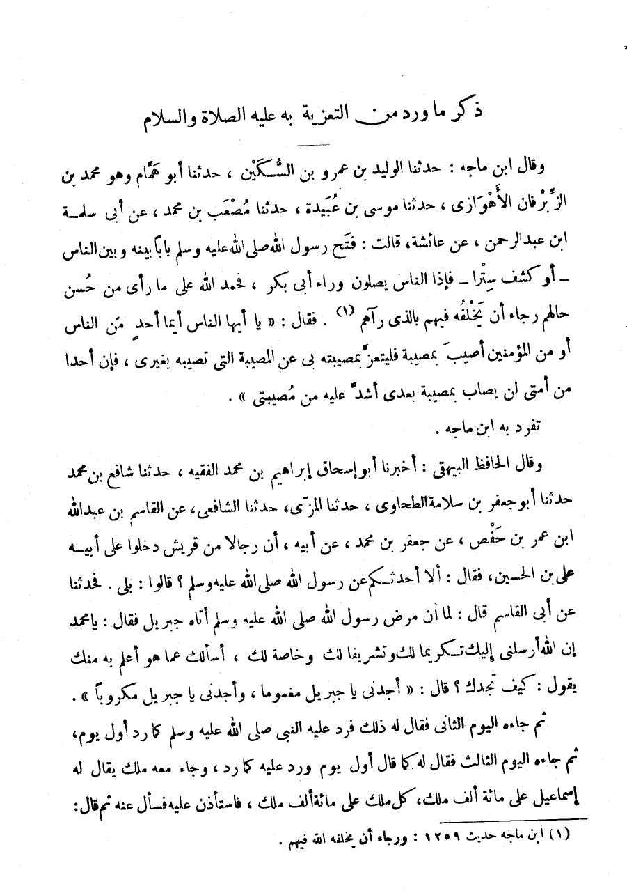 ذِكْرُ مَا وَرَدَ مِنَ التَّعْزِيَةِ بِهِ عَلَيْهِ الصَّلَاة وَالسَّلَام