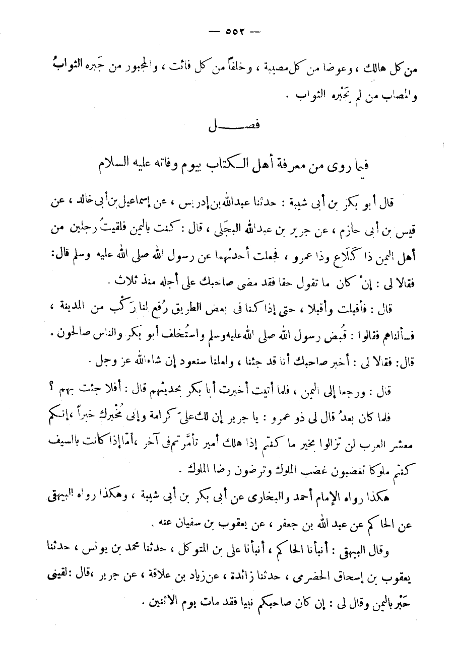 فَصْلٌ فِيمَا رُوِيَ مِنْ مَعْرِفَةِ أَهْلِ الْكِتَابِ بِيَوْمِ وَفَاته عَلَيْهِ السَّلَام قَالَ أَبُو بَكْرِ بْنُ أَبِي شَيْبَةَ: حَدَّثَنَا عَبْدُ اللَّهِ بْنُ إِدْرِيسَ، عَنْ إِسْمَاعِيلَ بْنِ أَبِي خَالِدٍ، عَنْ قَيْسِ بْنِ أَبِي حَازِمٍ، عَنْ جَرِيرِ بْنِ عَبْدِ اللَّهِ الْبَجَلِيِّ، قَالَ: كُنْتُ بِالْيَمَنِ فَلَقِيتُ رَجُلَيْنِ مِنْ أَهْلِ الْيَمَنِ ذَا كَلَاعٍ وَذَا عَمْرٍو، فَجَعَلْتُ أُحَدِّثُهُمَا عَنْ رَسُولِ اللَّهِ صَلَّى اللَّهُ عَلَيْهِ وَسَلَّمَ قَالَ: فَقَالَا لِي: إِنْ كَانَ مَا تَقُولُ حَقًّا فَقَدْ مَضَى صَاحِبُكَ عَلَى أَجَلِهِ مُنْذُ ثَلَاثٍ.