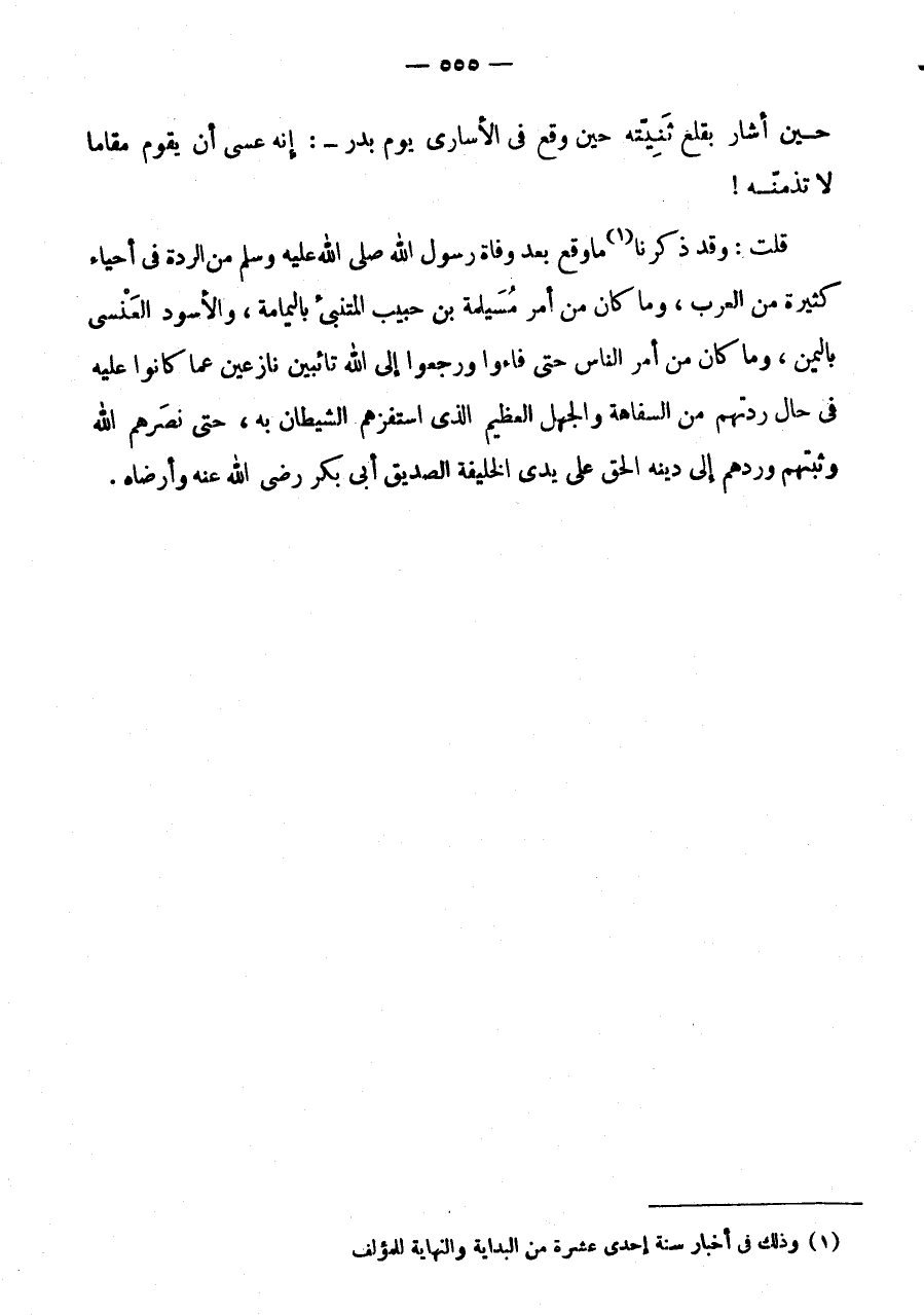 حِينَ أَشَارَ بِقَلْعِ ثَنِيَّتِهِ حِينَ وَقَعَ فِي الْأُسَارَى يَوْمَ بَدْرٍ -: إِنَّهُ عَسَى أَنْ يَقُومَ مقَاما لَا تذمنه! قلت: وَقد ذكرنَا (1) مَا وَقَعَ بَعْدَ وَفَاةِ رَسُولِ اللَّهِ صَلَّى اللَّهُ عَلَيْهِ وَسَلَّمَ مِنَ الرِّدَّةِ فِي أَحْيَاءٍ كَثِيرَةٍ مِنَ الْعَرَبِ، وَمَا كَانَ مِنْ أَمْرِ مُسَيْلِمَةَ بْنِ حَبِيبٍ الْمُتَنَبِّئِ بِالْيَمَامَةِ، وَالْأَسْوَدِ الْعَنْسِيِّ بِالْيَمَنِ، وَمَا كَانَ مِنْ أَمْرِ النَّاسِ حَتَّى فَاءُوا وَرَجَعُوا إِلَى اللَّهِ تَائِبِينَ نَازِعِينَ عَمَّا كَانُوا عَلَيْهِ فِي حَالِ رِدَّتِهِمْ مِنَ السَّفَاهَةِ وَالْجَهْلِ الْعَظِيمِ الَّذِي اسْتَفَزَّهُمُ الشَّيْطَانُ بِهِ، حَتَّى نَصَرَهُمُ اللَّهُ وَثَبَّتَهُمْ وَرَدَّهُمْ إِلَى دِينِهِ الْحَقِّ عَلَى يَدَيِ الْخَلِيفَةِ الصِّدِّيقِ أَبِي بَكْرٍ رَضِيَ الله عَنهُ وأرضاه.