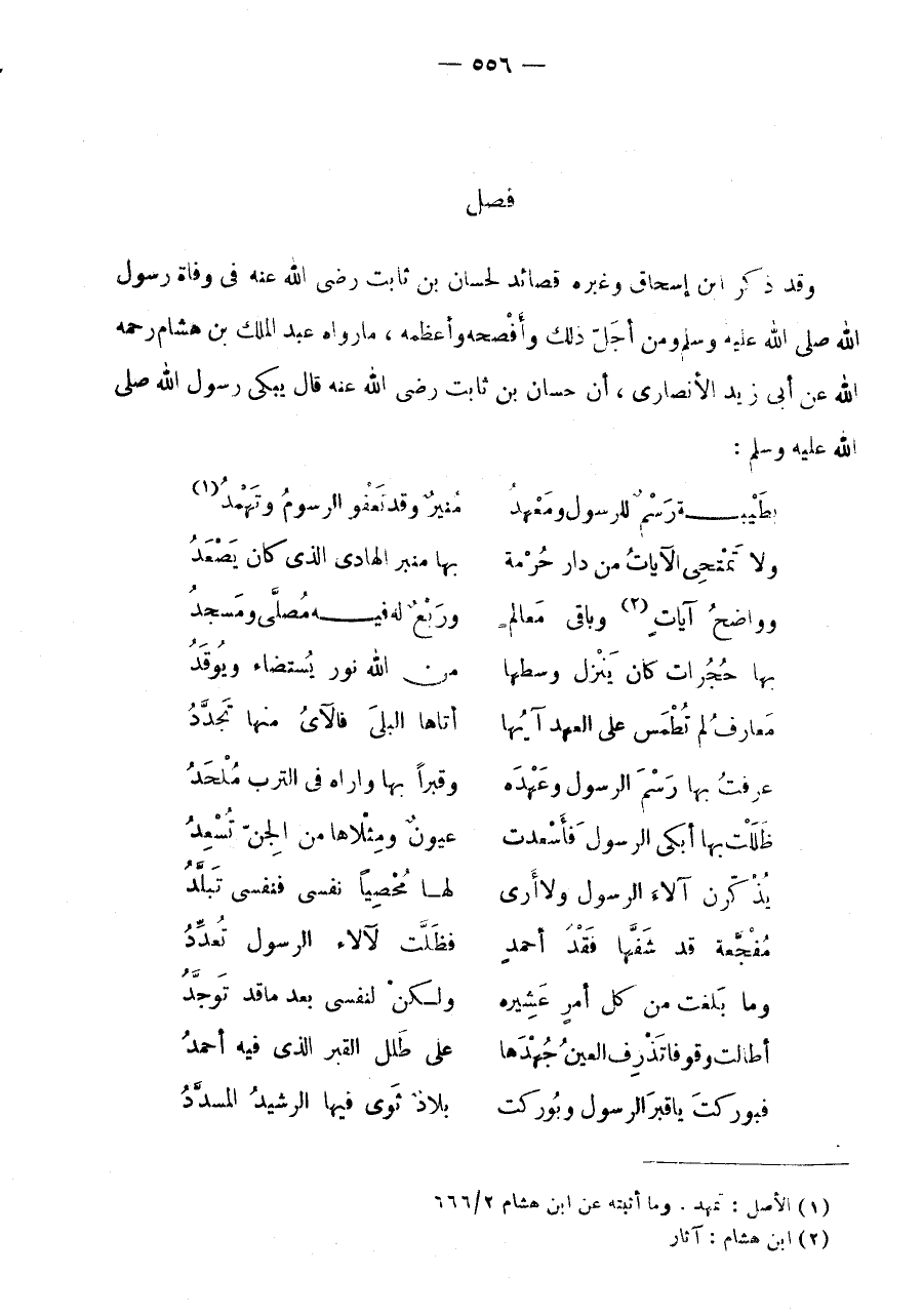فَصْلٌ وَقَدْ ذَكَرَ ابْنُ إِسْحَاقَ وَغَيْرُهُ قَصَائِدَ لِحَسَّانَ بْنِ ثَابِتٍ رَضِيَ اللَّهُ عَنْهُ فِي وَفَاةِ رَسُولِ اللَّهِ صَلَّى اللَّهُ عَلَيْهِ وَسَلَّمَ وَمِنْ أَجَلِّ ذَلِكَ وَأَفْصَحِهِ وَأَعْظَمِهِ، مَا رَوَاهُ عَبْدُ الْمَلِكِ بْنُ هِشَامٍ رَحِمَهُ اللَّهُ عَنْ أَبِي زَيْدٍ الْأَنْصَارِيِّ، أَنَّ حَسَّانَ بْنَ ثَابِتٍ رَضِيَ اللَّهُ عَنْهُ قَالَ يَبْكِي رَسُولَ اللَّهِ صَلَّى اللَّهُ عَلَيْهِ وَسَلَّمَ: بَطَيْبَةَ رَسْمٌ لِلرَّسُولِ وَمَعْهَدُ * مُنِيرٌ وَقَدْ تَعْفُو الرُّسُومُ وَتَهْمُدُ (1) وَلَا تَمْتَحِي الْآيَاتُ مِنْ دَارِ حُرْمَةٍ * بِهَا مِنْبَرُ الْهَادِي الَّذِي كَانَ يَصْعَدُ وَوَاضِحُ آيَاتٍ (2) وَبَاقِي مَعَالِمٍ * وَرَبْعٌ لَهُ فِيهِ مُصَلًّى وَمَسْجِدُ بِهَا حُجُرَاتٌ كَانَ يَنْزِلُ وَسْطَهَا * مِنَ اللَّهِ نُورٌ يُسْتَضَاءُ وَيُوقَدُ مَعَارِفُ لَمْ تُطْمَسْ عَلَى الْعَهْدِ آيُهَا * أَتَاهَا الْبِلَى فَالْآيُ مِنْهَا تَجَدَّدُ عَرَفْتُ بِهَا رَسْمَ الرَّسُولِ وَعَهْدَهُ * وَقَبْرًا بِهَا وَارَاهُ فِي التُّرْبِ مَلْحَدُ