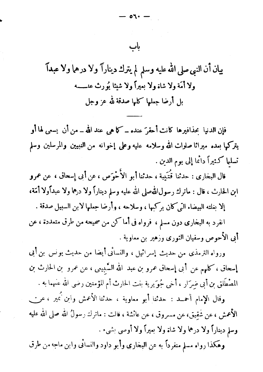 قَالَ البُخَارِيّ: حَدثنَا قُتَيْبَة، حَدثنَا أَبُو الْأَحْوَصِ، عَنْ أَبِي إِسْحَاقَ، عَنْ عَمْرِو ابْن الْحَارِثِ، قَالَ: مَا تَرَكَ رَسُولُ اللَّهِ صَلَّى اللَّهُ عَلَيْهِ وَسَلَّمَ دِينَارًا وَلَا دِرْهَمًا وَلَا عَبْدًا وَلَا أَمَةً، إِلَّا بَغْلَتَهُ الْبَيْضَاءَ الَّتِي كَانَ يَرْكَبُهَا، وَسِلَاحَهُ، وَأَرْضًا جَعَلَهَا لِابْنِ السَّبِيلِ صَدَقَةً.