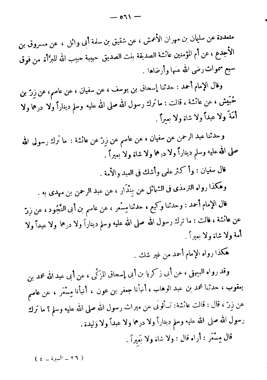 قَالَ الْإِمَامُ أَحْمَدُ: وَحدثنَا وَكِيع، حَدثنَا مِسْعَرٌ، عَنْ عَاصِمِ بْنِ أَبِي النَّجُودِ، عَنْ زِرٍّ عَنِ عَائِشَةَ، قَالَتْ: مَا تَرَكَ رَسُولُ اللَّهِ صَلَّى اللَّهُ عَلَيْهِ وَسَلَّمَ دِينَارًا وَلَا درهما وَلَا عبدا وَلَا أمة لَا شَاةً وَلَا بَعِيرًا.