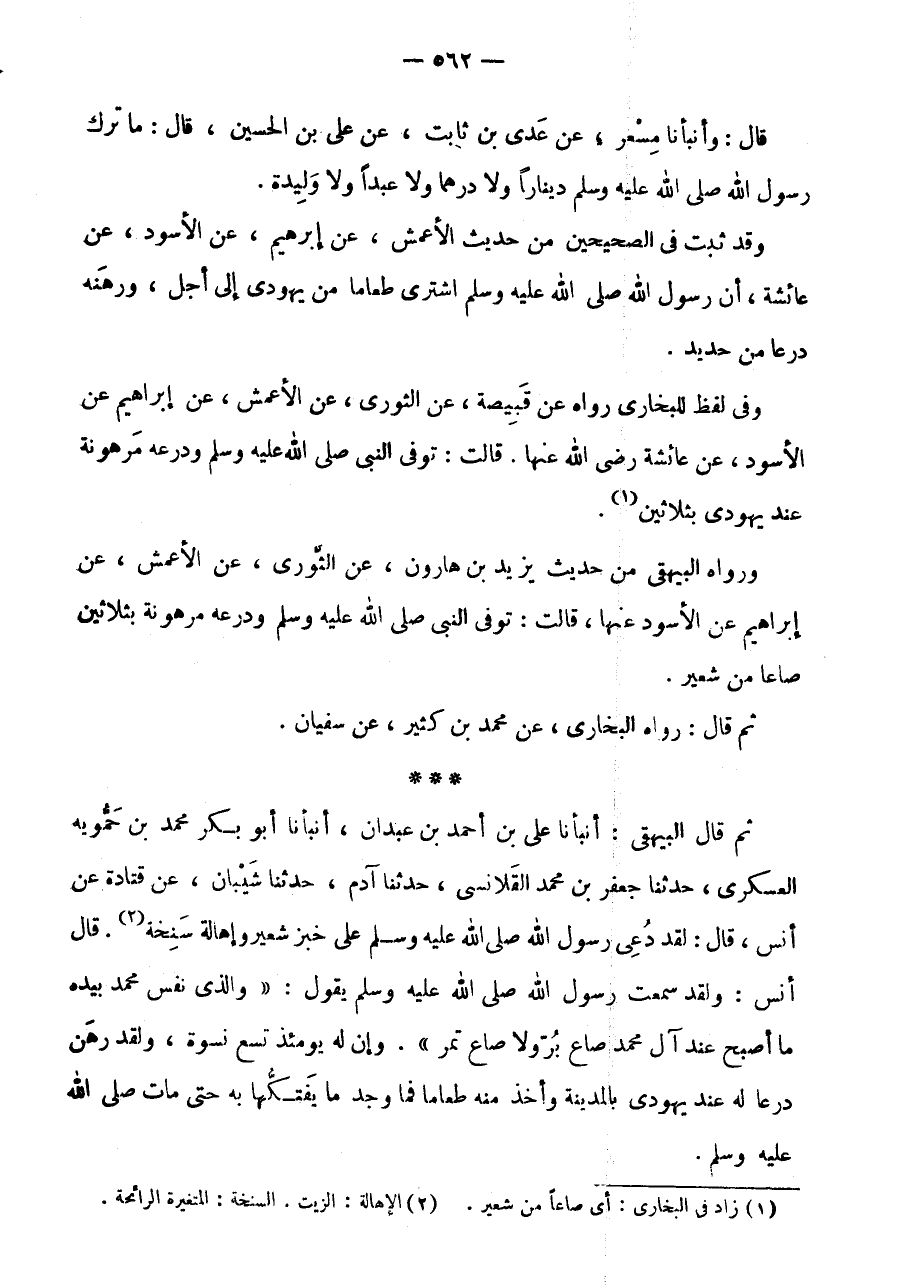 وَرَوَاهُ الْبَيْهَقِيُّ مِنْ حَدِيثِ يَزِيدَ بْنِ هَارُونَ، عَنِ الثَّوْرِيِّ، عَنِ الْأَعْمَشِ، عَنْ إِبْرَاهِيمَ عَنِ الْأَسْوَدِ عَنْهَا، قَالَتْ: تُوُفِّيَ النَّبِيُّ صَلَّى اللَّهُ عَلَيْهِ وَسَلَّمَ وَدِرْعُهُ مَرْهُونَةٌ بِثَلَاثِينَ صَاعًا مِنْ شَعِيرٍ.