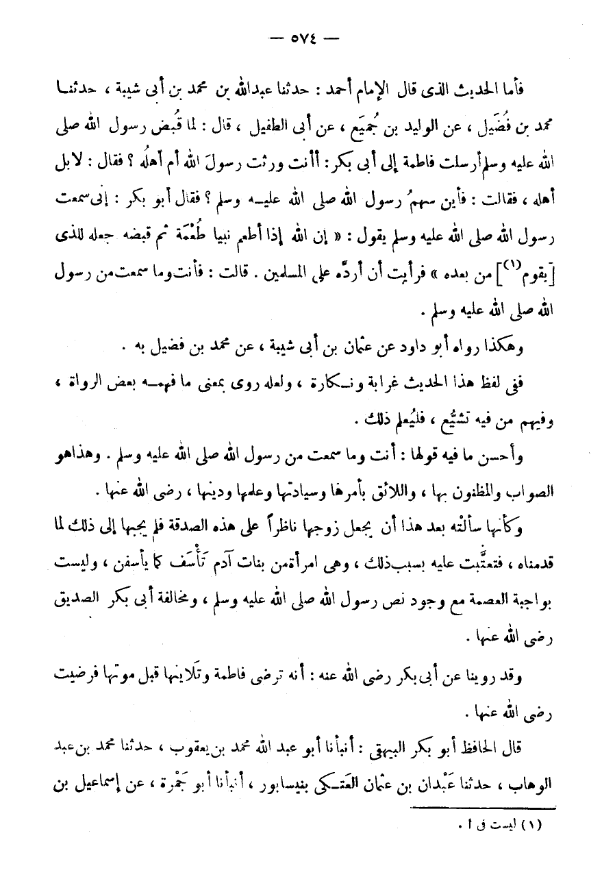 فَأَمَّا الْحَدِيثُ الَّذِي قَالَ الْإِمَامُ أَحْمَدُ: حَدَّثَنَا عَبْدُ اللَّهِ بْنُ مُحَمَّدِ بْنِ أَبِي شَيْبَةَ، حَدَّثَنَا مُحَمَّدُ بْنُ فُضَيْلٍ، عَنِ الْوَلِيدِ بْنِ جُمَيْعٍ، عَنْ أَبِي الطُّفَيْلِ، قَالَ: لَمَّا قُبِضَ رَسُولُ اللَّهِ صَلَّى اللَّهُ عَلَيْهِ وَسَلَّمَ أَرْسَلَتْ فَاطِمَةُ إِلَى أَبِي بَكْرٍ: أَأَنْتَ وَرِثْتَ رَسُولَ اللَّهِ أم أَهله؟ فَقَالَ: لَا بل أَهله، فَقَالَت: فَأَيْنَ سَهْمُ رَسُولِ اللَّهِ صَلَّى اللَّهُ عَلَيْهِ وَسَلَّمَ؟ فَقَالَ أَبُو بَكْرٍ: إِنِّي سَمِعْتُ رَسُولَ اللَّهِ صَلَّى اللَّهُ عَلَيْهِ وَسَلَّمَ يَقُولُ: " إِنَّ اللَّهَ إِذَا أَطْعَمَ نَبِيًّا طُعْمَةً ثُمَّ قَبَضَهُ جَعَلَهُ لِلَّذِي [يَقُومُ (1) ] مِنْ بَعْدِهِ " فَرَأَيْتُ أَنْ أَرُدَّهُ عَلَى الْمُسْلِمِينَ.