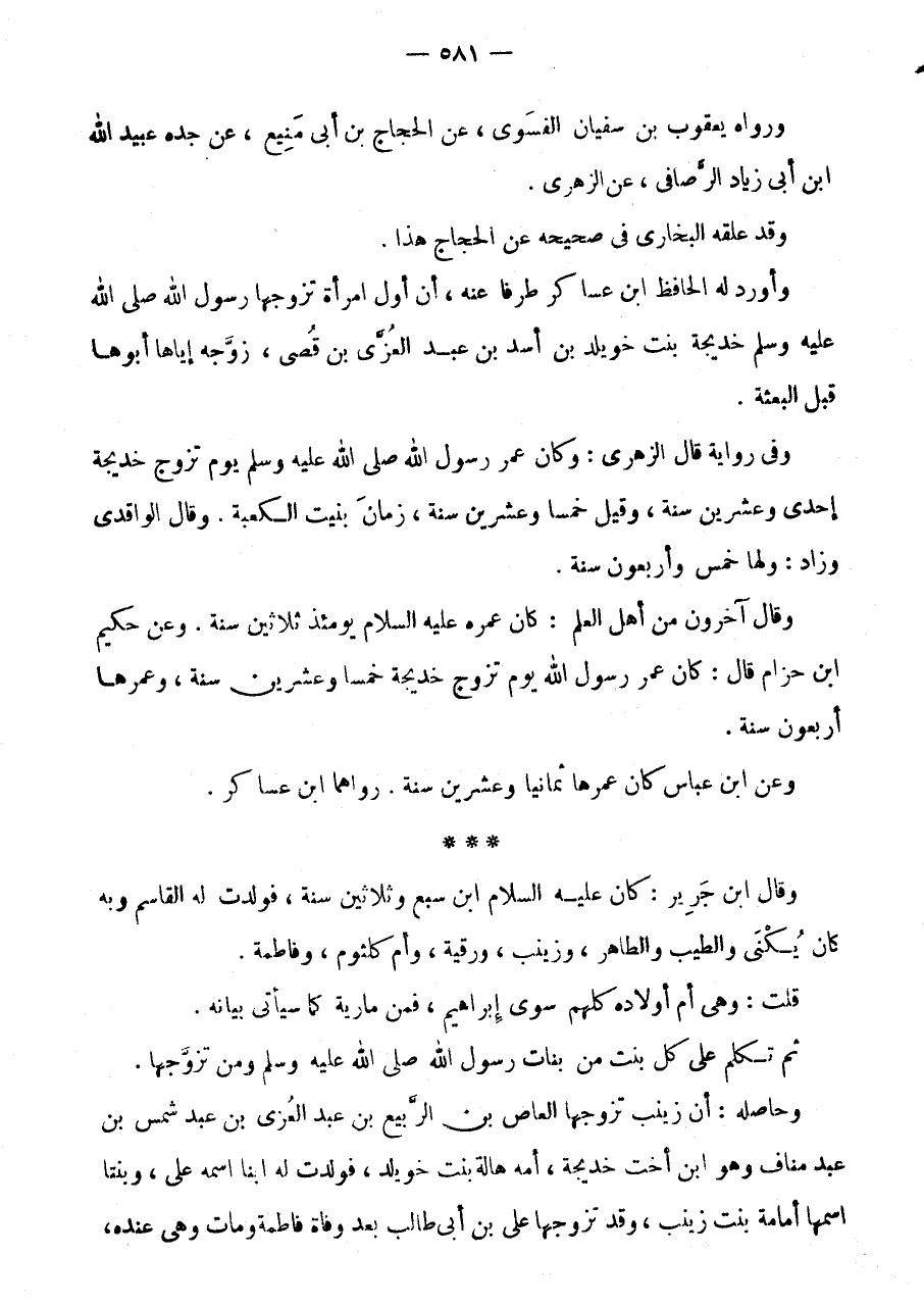 * * * وَقَالَ ابْن جرير: كَانَ عَلَيْهِ السَّلَام ابْنَ سَبْعٍ وَثَلَاثِينَ سَنَةً، فَوَلَدَتْ لَهُ الْقَاسِمَ وَبِهِ كَانَ يُكْنَى وَالطَّيِّبَ وَالطَّاهِرَ، وَزَيْنَبَ، وَرُقَيَّةَ، وَأُمَّ كُلْثُومٍ، وَفَاطِمَةَ.