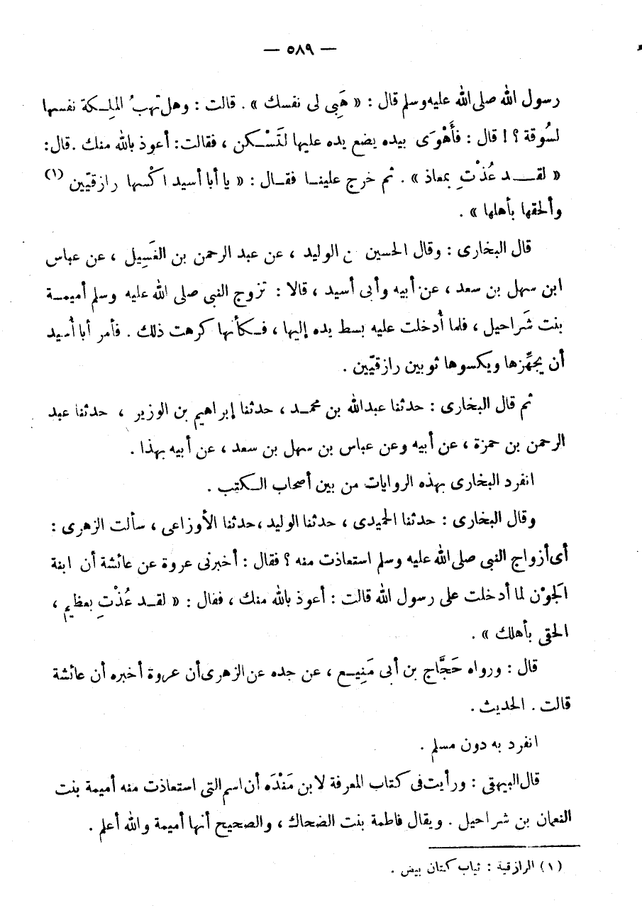 قَالَ الْبُخَارِيُّ: وَقَالَ الْحُسَيْنُ بْنُ الْوَلِيدِ، عَنْ عَبْدِ الرَّحْمَنِ بْنِ الْغَسِيلِ، عَنْ عَبَّاس ابْن سَهْلِ بْنِ سَعْدٍ، عَنْ أَبِيهِ وَأَبِي أُسَيْدٍ، قَالَا: تَزَوَّجَ النَّبِيُّ صَلَّى اللَّهُ عَلَيْهِ وَسَلَّمَ أُمَيْمَةَ بِنْتَ شَرَاحِيلَ، فَلَمَّا أُدْخِلَتْ عَلَيْهِ بَسَطَ يَدَهُ إِلَيْهَا، فَكَأَنَّهَا كَرِهَتْ ذَلِكَ.