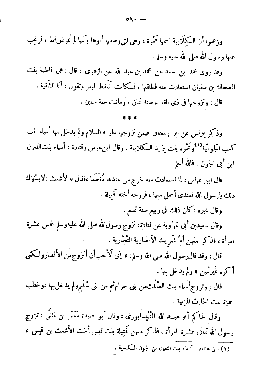 * * * وَذَكَرَ يُونُسُ عَنِ ابْنِ إِسْحَاقَ فِيمَنْ تزَوجهَا عَلَيْهِ السَّلَام وَلَمْ يَدْخُلْ بِهَا أَسْمَاءَ بِنْتَ كَعْبٍ الْجَوْنَيَّةَ (1) وَعَمْرَةَ بِنْتَ يَزِيدَ الْكِلَابِيَّةَ.