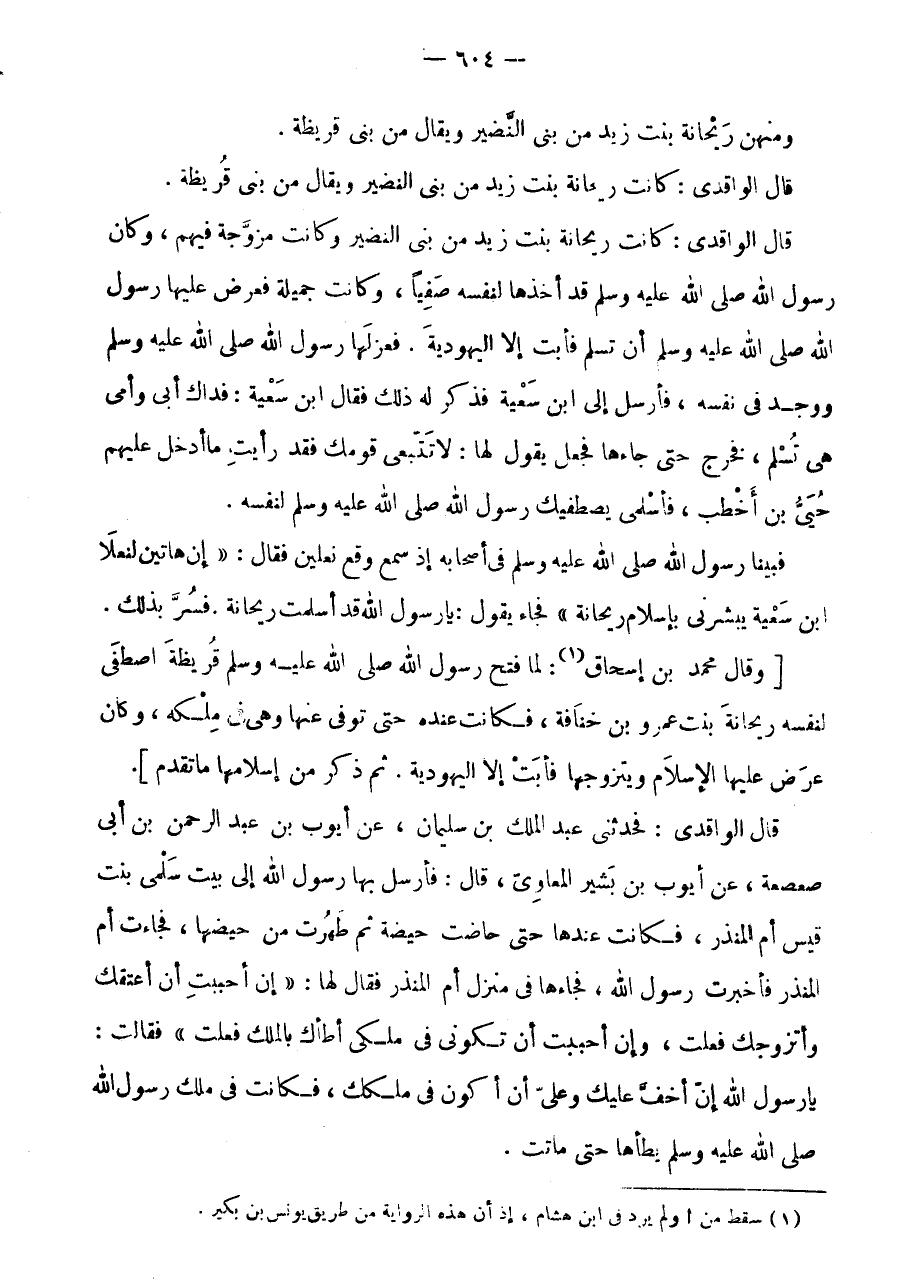 قَالَ الْوَاقِدِيُّ: كَانَتْ رَيْحَانَةُ بِنْتُ زَيْدٍ مِنْ بَنِي النَّضِيرِ وَكَانَتْ مُزَوَّجَةً فيهم، وَكَانَ رَسُولُ اللَّهِ صَلَّى اللَّهُ عَلَيْهِ وَسَلَّمَ قَدْ أَخَذَهَا لِنَفْسِهِ صَفِيًّا، وَكَانَتْ جَمِيلَةً فَعَرَضَ عَلَيْهَا رَسُولُ اللَّهِ صَلَّى اللَّهُ عَلَيْهِ وَسَلَّمَ أَنْ تُسْلِمَ فَأَبَتْ إِلَّا الْيَهُودِيَّةَ.