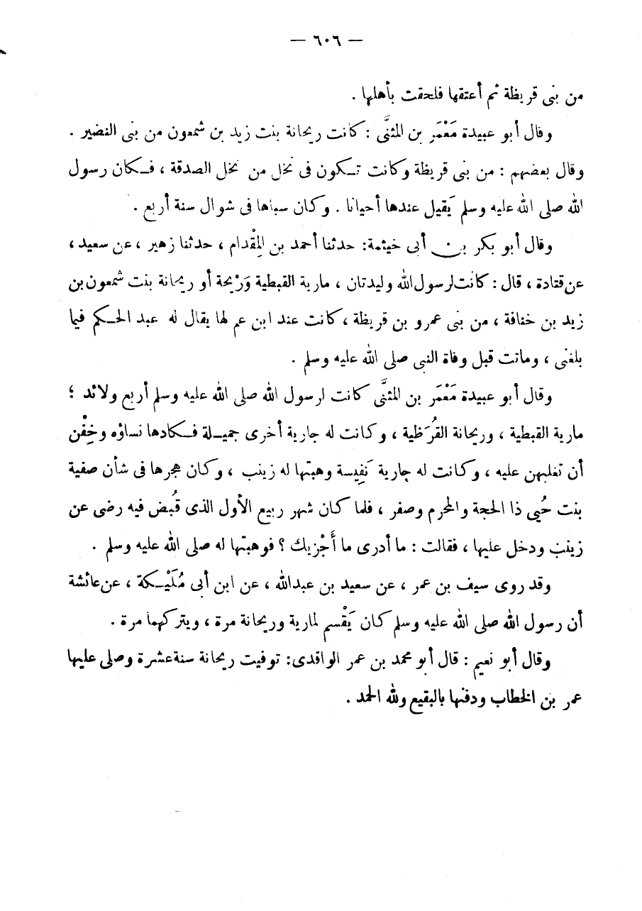 وَقَالَ أَبُو بَكْرِ بْنُ أَبِي خَيْثَمَةَ: حَدَّثَنَا أَحْمد بن الْمِقْدَام، حَدثنَا زُهَيْرٌ، عَنْ سَعِيدٍ، عَنْ قَتَادَةَ، قَالَ: كَانَتْ لرَسُول الله وليدتان، مَارِيَة الْقبْطِيَّة وريحة أَوْ رَيْحَانَةُ بِنْتُ شَمْعُونَ بْنِ زَيْدِ بْنِ خُنَافَةَ، مِنْ بَنِي عَمْرِو بْنِ قُرَيْظَةَ، كَانَتْ عِنْدَ ابْنِ عَمٍّ لَهَا يُقَالُ لَهُ عَبْدُ الْحَكَمِ فِيمَا بَلَغَنِي، وَمَاتَتْ قَبْلَ وَفَاةِ النَّبِيِّ صَلَّى اللَّهُ عَلَيْهِ وَسَلَّمَ.